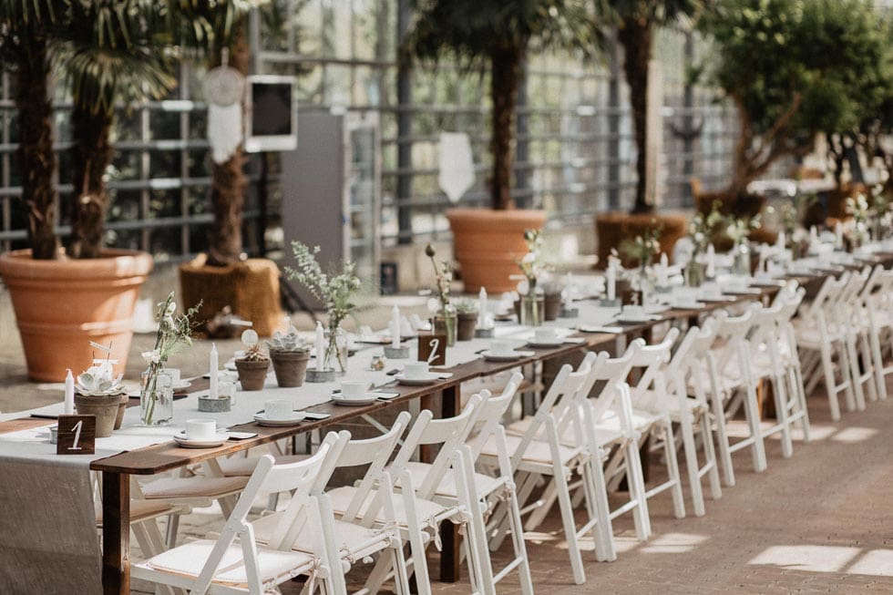 Falls das Gewächshaus mit Palmen oder tropischen Pflanzen ausgestaltet ist, schrenkt euch das auch bei Blumenwahl für die Tischdeko ein. Auf der anderen Seite habt ihr den Vorteil, nicht allzu viel Deko ergänzen zu müssen, da die Pflanzen bereits einen atemberaubenden Rahmen schenken.