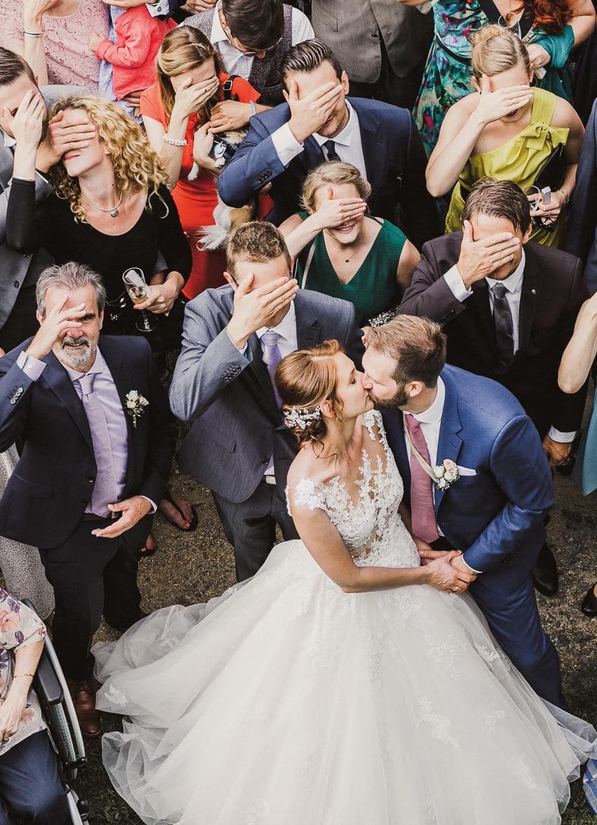 Plant diese Fotos zum Ende des Brautpaarshootings ein. Denn so können alle nach dem Sektempfang oder Kaffeetrinken einfach auf dem Areal der Location zu euch stoßen.