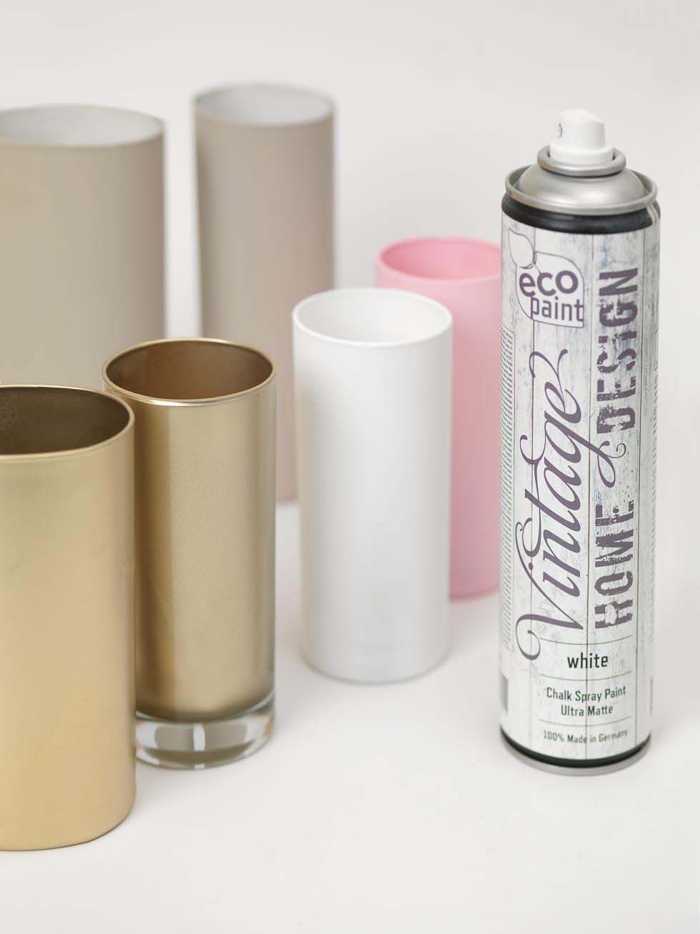 Mit ein bisschen Sprühfarbe in Metallic oder Kreidefarbe könnt ihr jedes Glas hochzeitsfein machen und farblich anpassen.