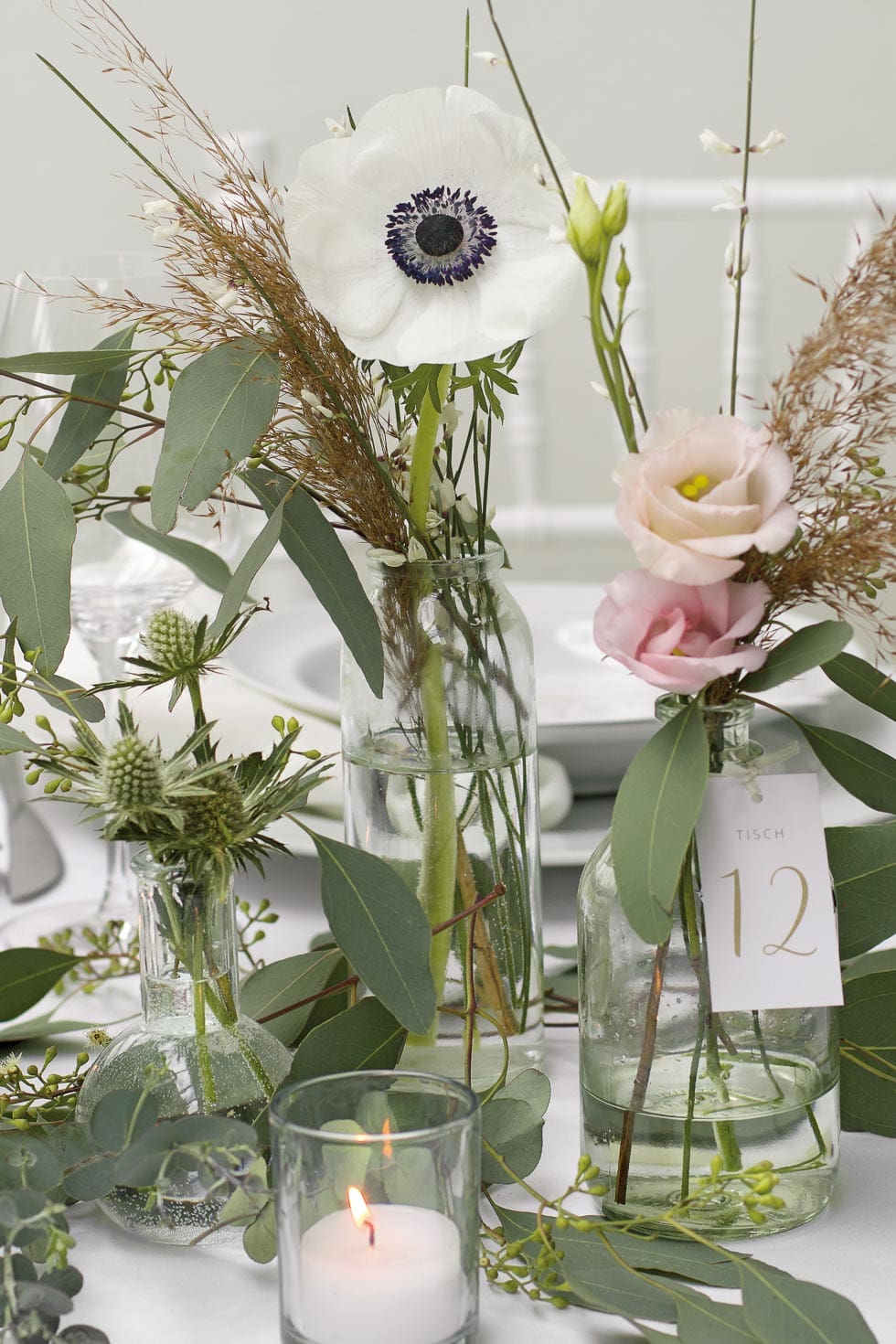 - Füllt die Flaschen mit Wasser und arrangiert sie auf dem Tisch. Größere Vasen am besten in der Mitte und kleine drumherum.