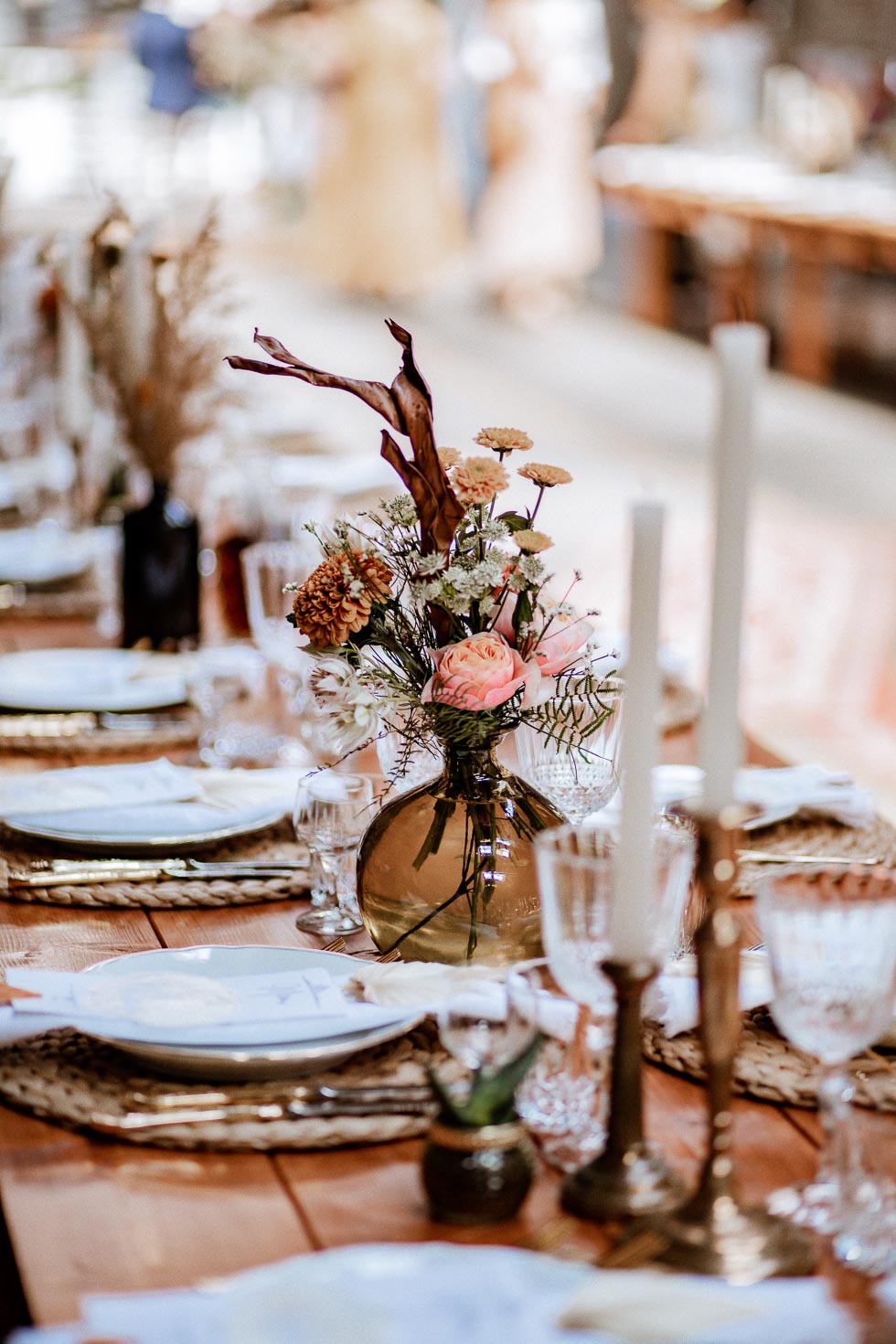 Bei der Boho Tischdeko unten ganz es noch einen günstigen Trick: Ihr wurden nämlich teure stabilisierte Trockenblumen durch richtige getrocknete Floralien verwendet.