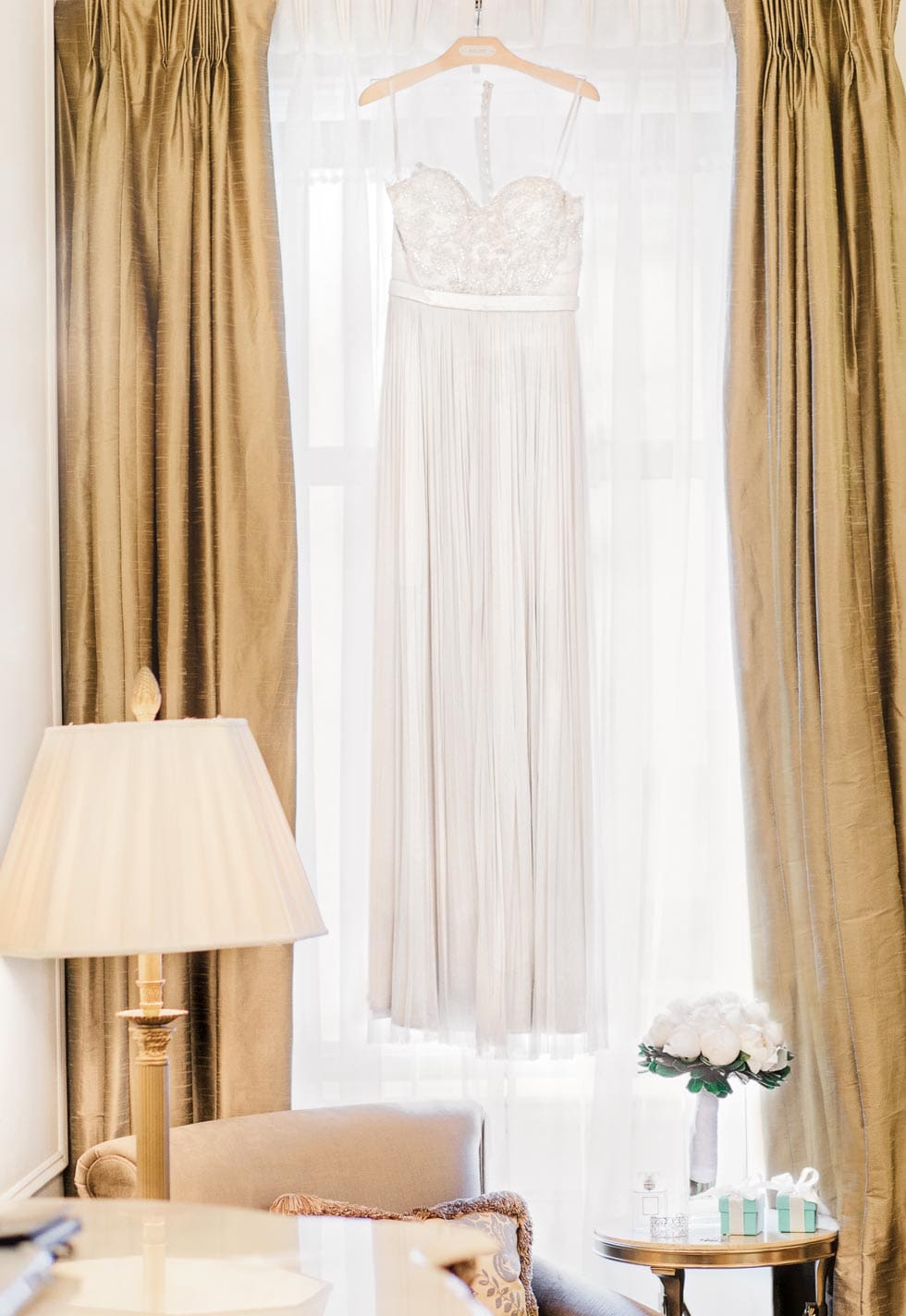 Auf dem Zimmer wurden die beiden von einer Champagnerflasche, Macarons und in Schokolade gehüllten Erdbeeren überrascht. „Ich zog mich auch erst einmal um. Als Brautpaar werden einem in New York überall Glückwünsche zugerufen und zu jedem Kuss bricht eine riesige Welle aus klatschenden Menschen aus“, schmunzelt die Braut. „Etwas Privatsphäre und das Verlorengehen in der Menge war dann am Abend ganz wohltuend.“