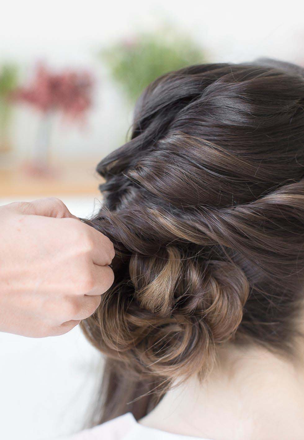 Vorne beginnend wird die Seitenpartie nun locker zum Kopf hin gedreht. Dabei immer wieder Haare von unten aufnehmen, um einen Kranzeffekt zu erreichen.
