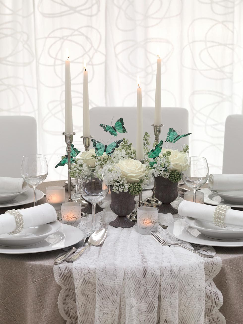 Die Teelichter werden zusätzlich als Platzkarte eingesetzt und bilden mit der geschwungenen Schrift die perfekte Brücke zwischen Historik und Moderne.