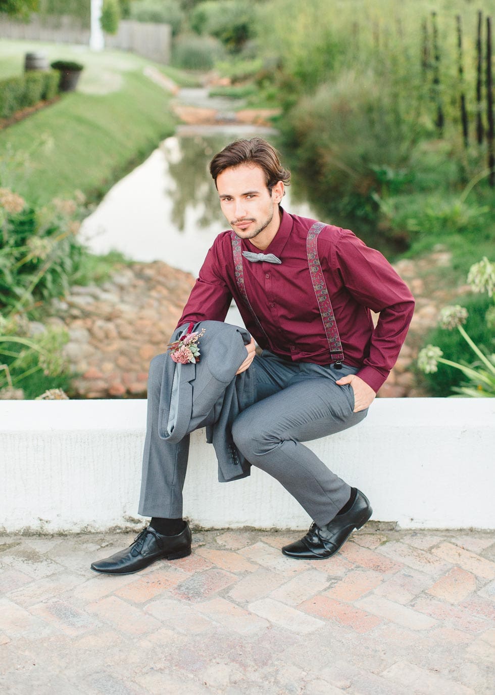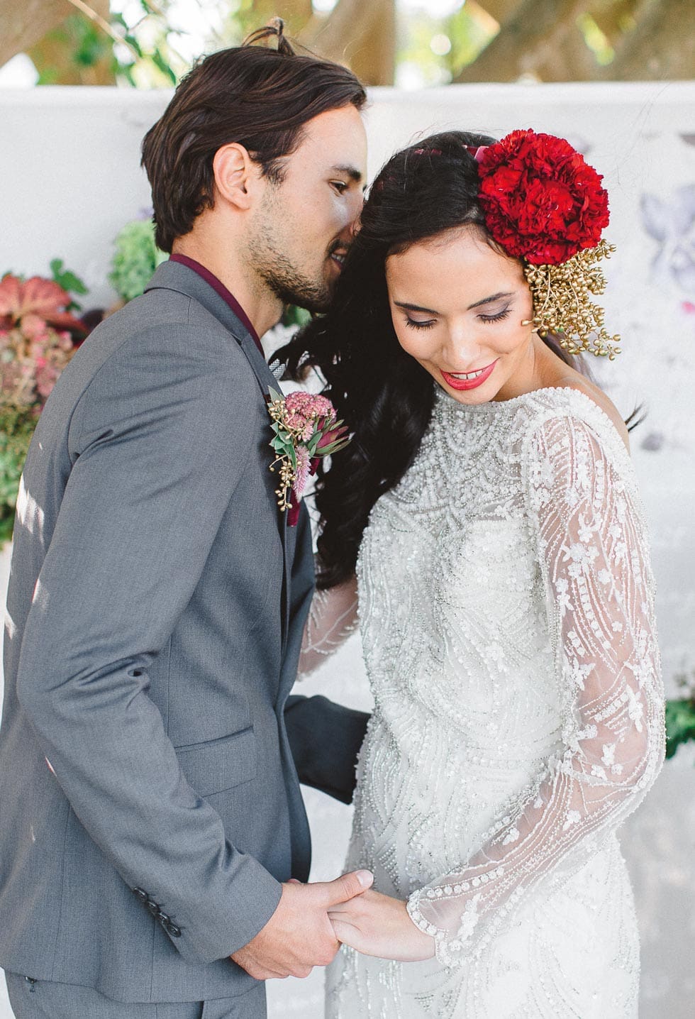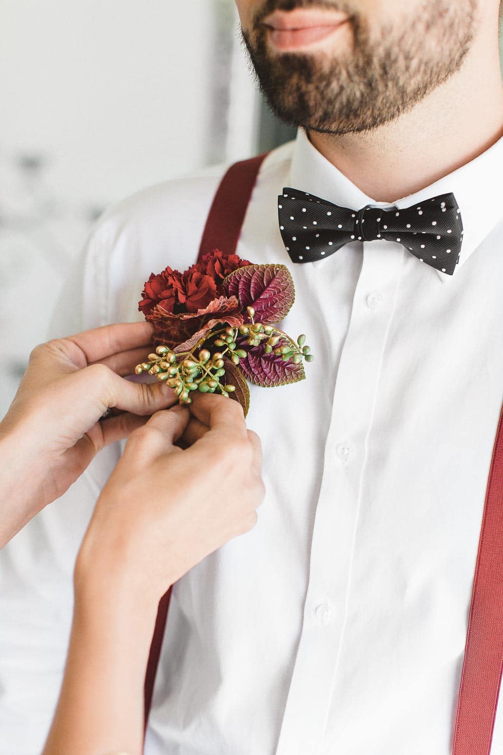 Nur für der Haarschmuck nimmt die Konzeptfarbe Marsala auf und ergänzt so das Kleid der Trauzeugin sowie der Anzug des Bräutigams.
