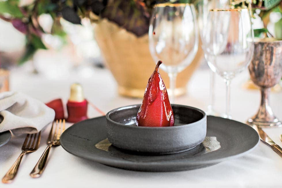 Die Blumengestecke faszinieren durch ihr unglaublich vielfältiges Blattgrün und thronen in goldenen Übertöpfen. Diese Opulenz findet sich auch in den mit Goldrand versehenen Gläsern und dem goldenen Besteck wieder. Wie im Schlaraffenland kann man zudem ganz einfach leckere Macarons, Granatäpfel oder Feigen aus der Deko „pflücken“. Als Dessert wird eine mit Rotwein beschwipste Birne serviert, die farblich perfekt ins Gesamtbild passt. Die Tischnummern sind aus zart getöntem Acrylglas geschnitten. Unser Tipp: Diese kann man beispielsweise beim Messebauer individuell fertigen lassen.