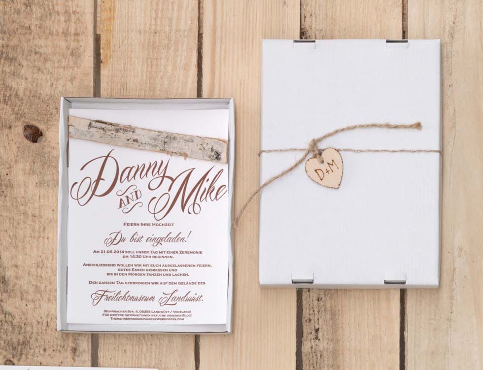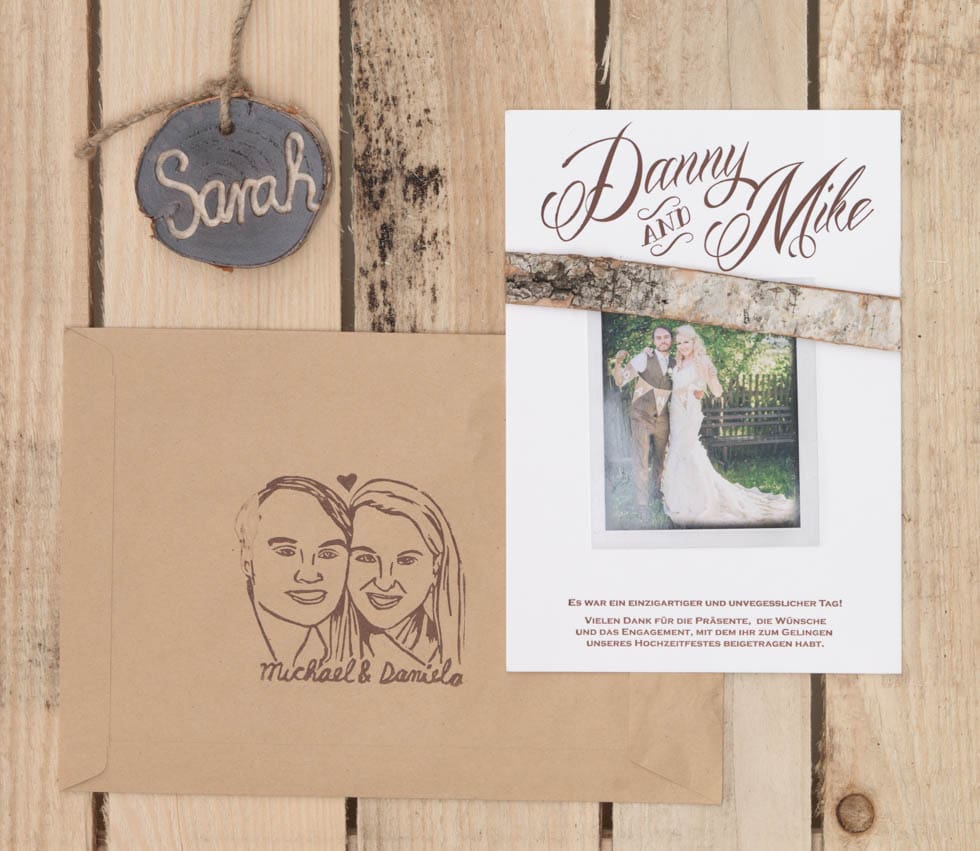 Für ihre Hochzeitseinladung haben sie dann einen wundervollen Schriftzug gestaltet uns sich einen Stempel von ihrem Paarfoto machen lassen, das sich als roten Faden gemeinsam mit Birke-Elementen und Kraftpapier durch die gesamte Hochzeit zieht.