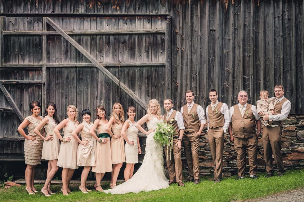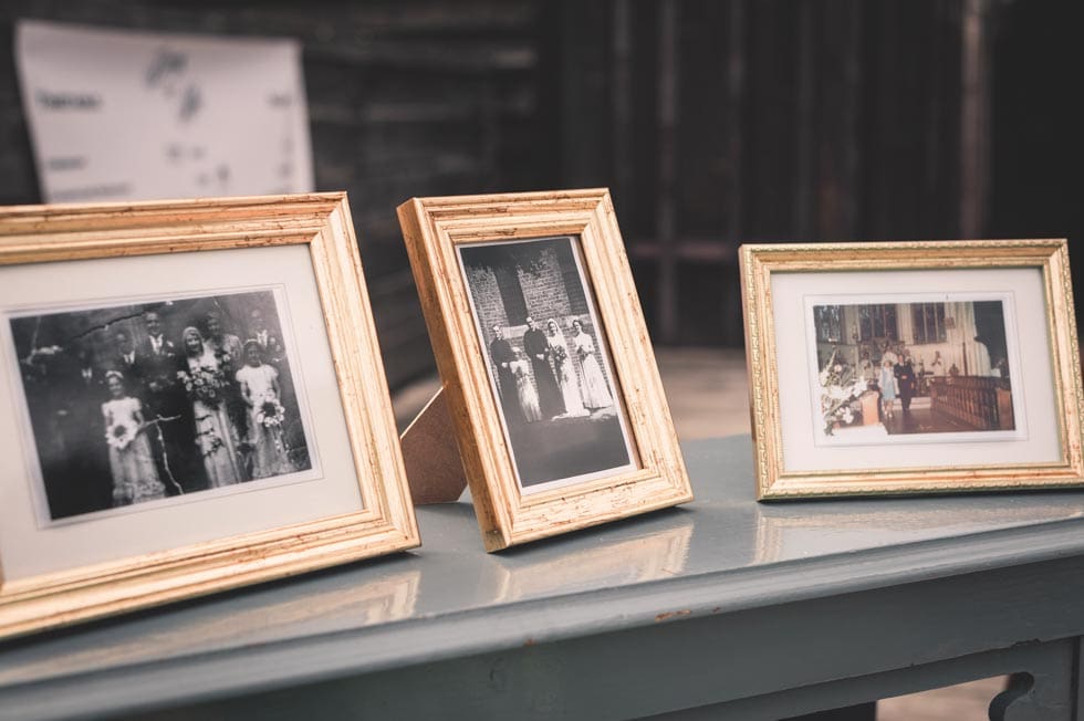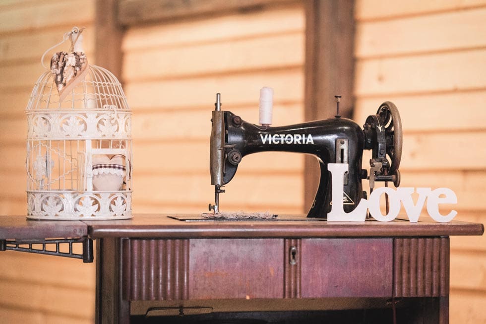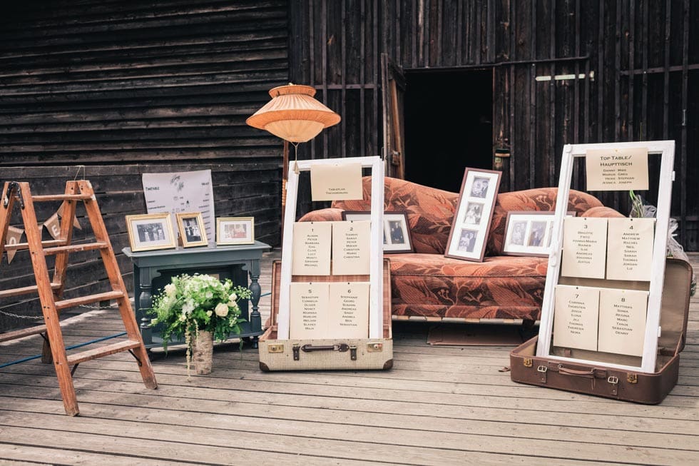 „Im Freilichtmuseum Landwüst hatten wir verschiedene Orte für die Trauung, die Photobooth, den Nachmittagskaffee und das Fest ausgesucht. Weil alles ein harmonisches Gesamtbild ergeben sollte, haben wir überall schicke Vintage-Elemente integriert, wie zum Beispiel Kronleuchter, Vogelkäfige, Koffer, Sackleinen, Spitze, Birkenholz oder alte Holzfenster. Alte Familienfotos machten das Gesamtbild zusätzlich harmonisch und persönlich.