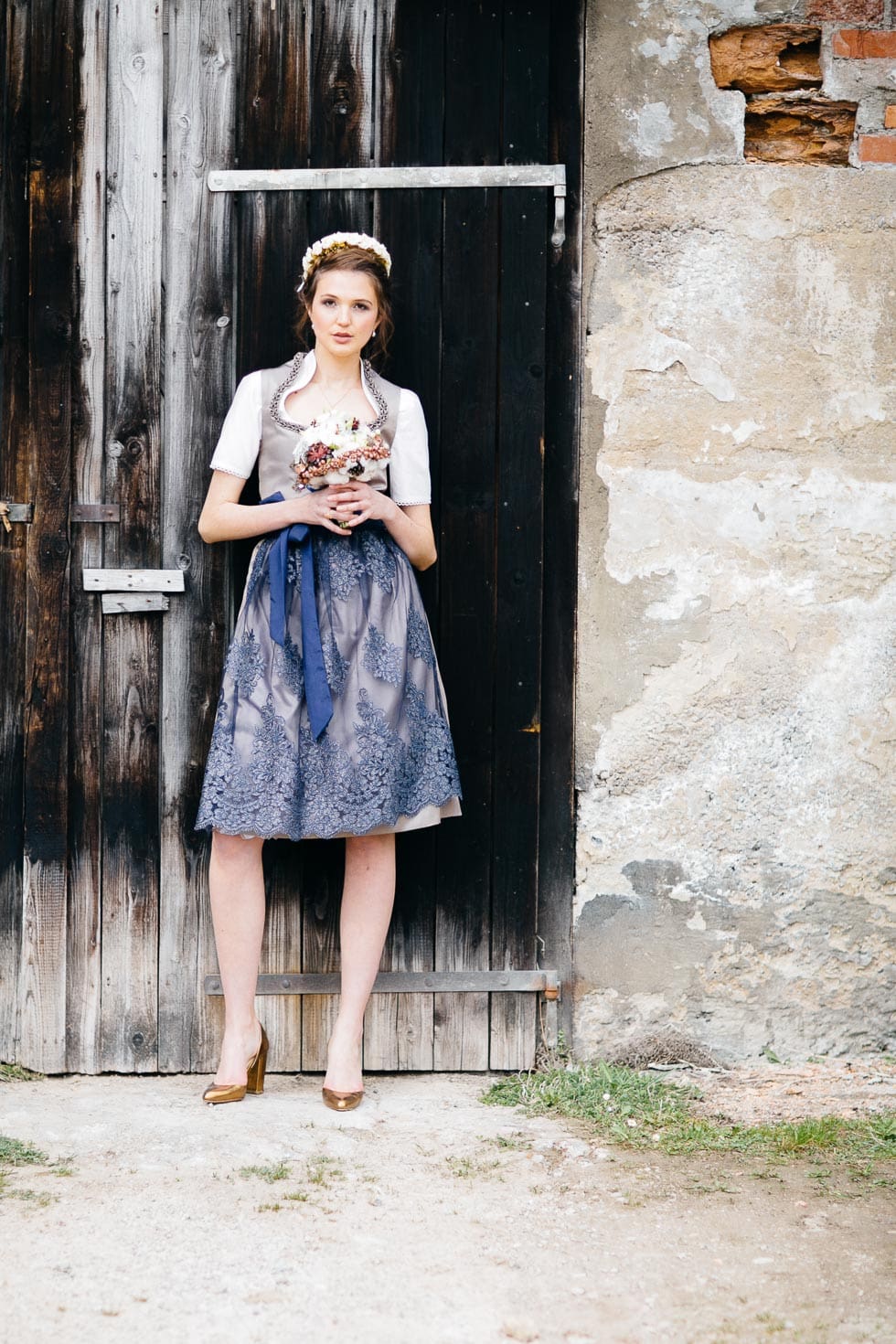 Modern wirkt euer Brautdirndl, wenn es sich farblich am Hochzeitskonzept orientiert. Im Beispiel weiter unten besteht es aus einem Oberteil in einem angesagten Taupe-Farbton und einer stahlblauen Spitzenschürze.