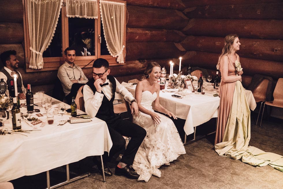 „Am Abend besuchte uns mein ehemaliger Fussballtrainer und hat mit uns und unseren Gästen ein kleines Theater gespielt“, berichtet Andreas. „Es war so lustig und wir krümmten uns vor Lachen.“ Als wir vom Abend-Shooting zurückkamen empfingen uns unsere Gäste mit Wunderkerzen und einer Rede meiner Schwester und Trauzeugin – unsere Eltern haben noch einen lustigen Tanz dargeboten. Das war wirklich cool!“