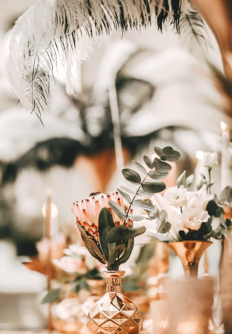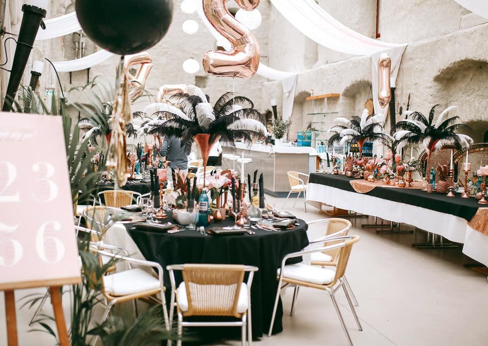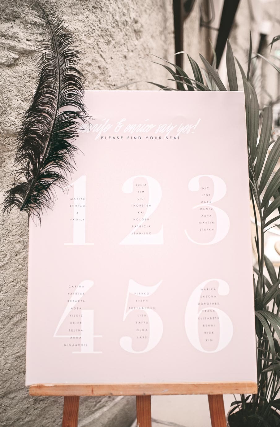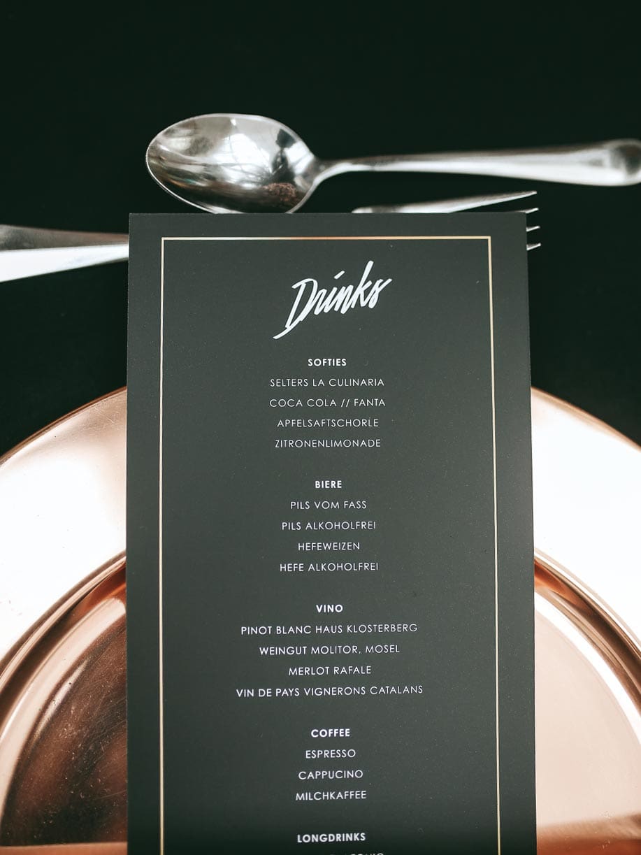 „Glücklicherweise wussten wir genau, was wir wollten: Tropischer Flair kombiniert mit außergewöhnlichen Elementen, verbunden mit den Farben Rosé, Schwarz und Kupfer als stylishes Gesamtkonzept. Da Enrico Grafiker ist, lag es nahe, zunächst die Papeterie zu gestalten, woraus schnell das Thema der Hochzeit wuchs. Bei der Trauung blumige Romantik und am Abend ein Tropical Gatsby Flair.