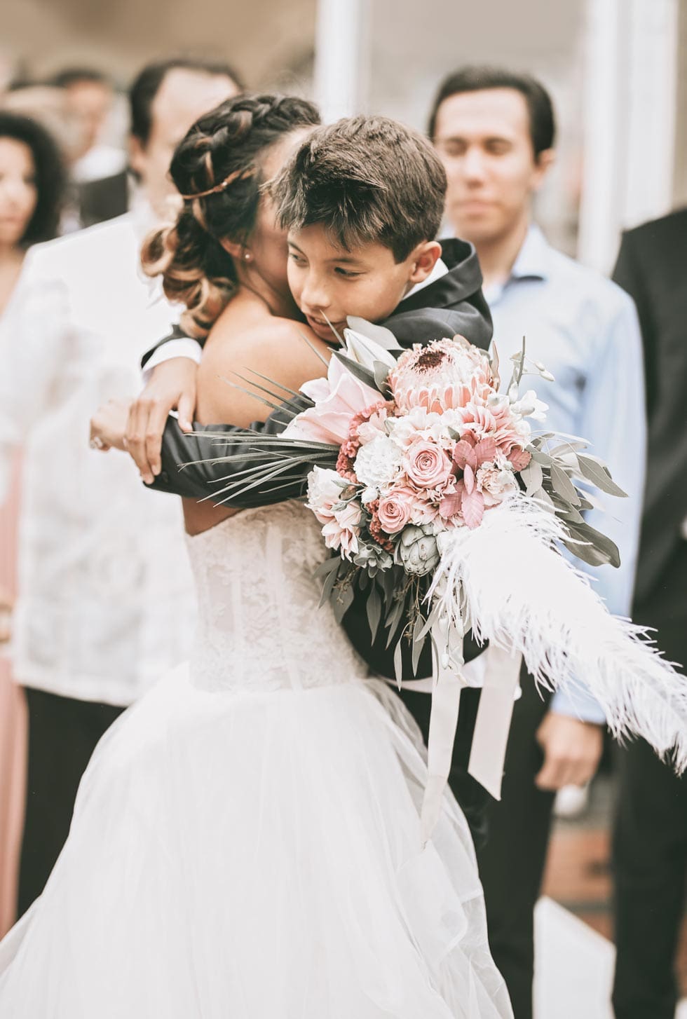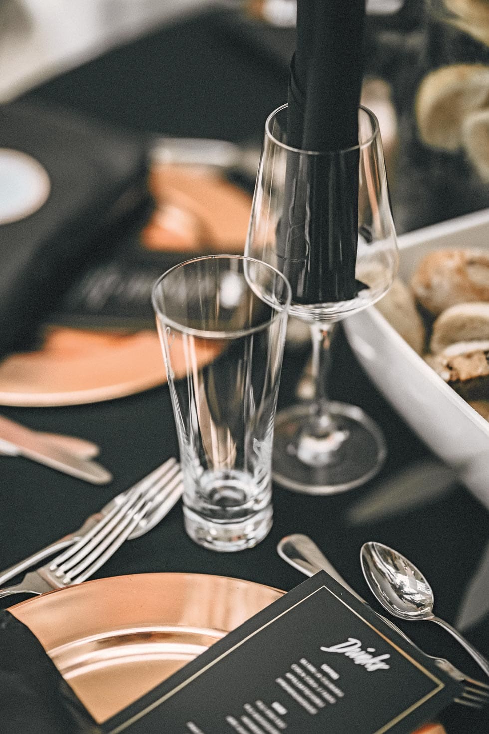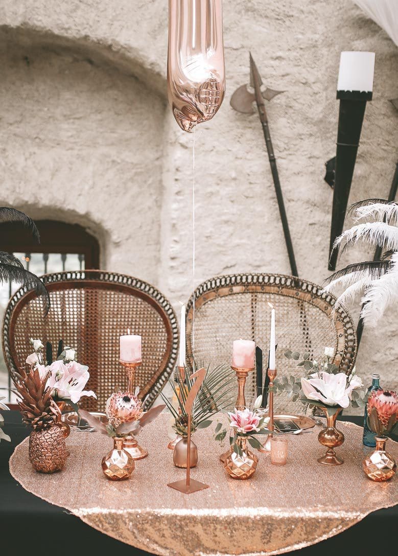 „Glücklicherweise wussten wir genau, was wir wollten: Tropischer Flair kombiniert mit außergewöhnlichen Elementen, verbunden mit den Farben Rosé, Schwarz und Kupfer als stylishes Gesamtkonzept. Da Enrico Grafiker ist, lag es nahe, zunächst die Papeterie zu gestalten, woraus schnell das Thema der Hochzeit wuchs. Bei der Trauung blumige Romantik und am Abend ein Tropical Gatsby Flair.