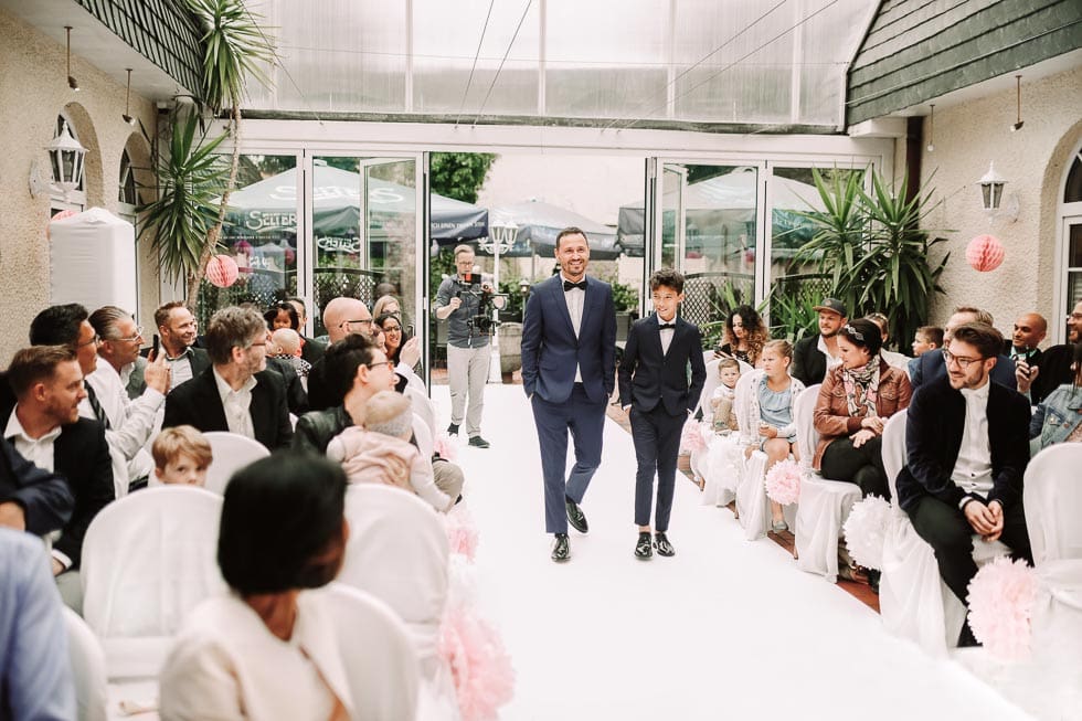Ursprünglich hatten Marifé und Enrico eine Trauung im Freien geplant, doch der Wettertrend versprach immer mehr, dass es am Tag ihrer Hochzeit regnen sollte. „Also organisierten wir die Trauung neu und zogen in den Wintergarten unseres Hotels um“, stöhnten die beiden.