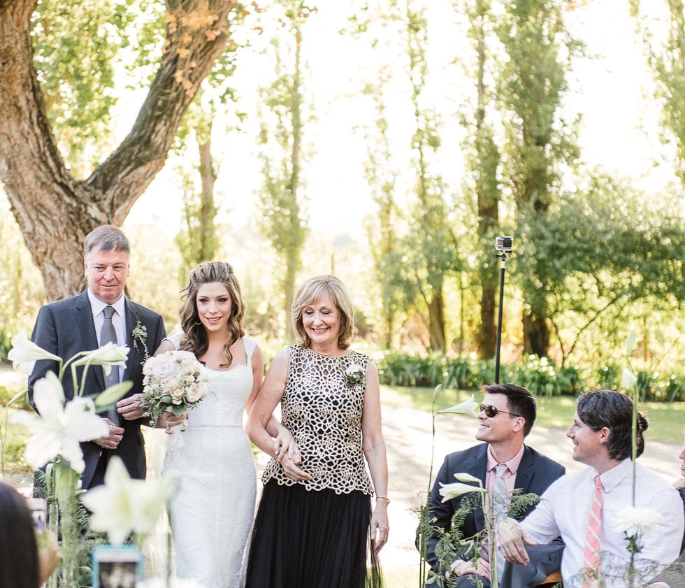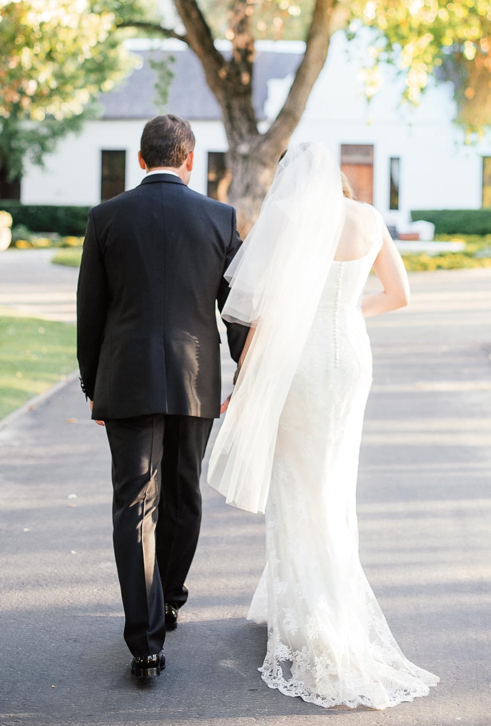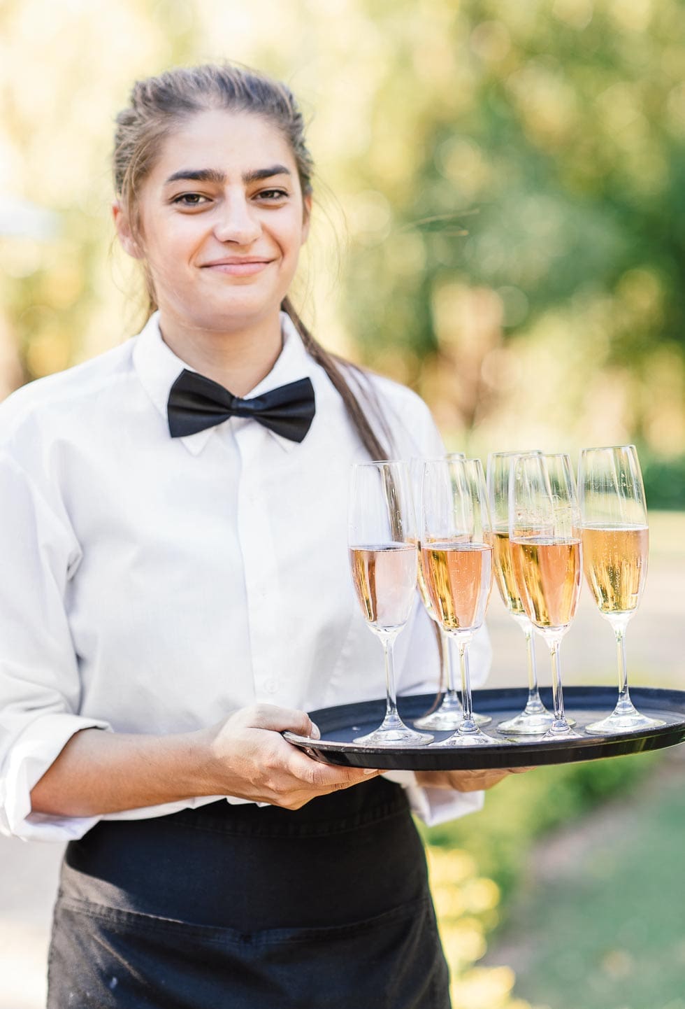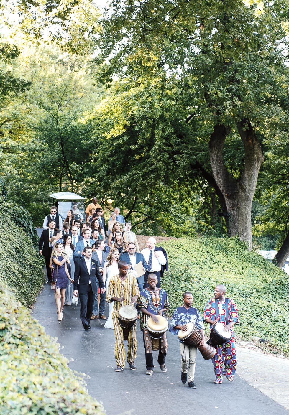 „Die Trauung fand auf einem Berg in der Nähe der Location statt. Um den Weg bergabwärts noch angenehmer zu gestalten, versorgten wir alle Gäste mit einem Glas Champagner für den Weg und engagierten südafrikanische Trommler, die uns mit einem traditionellen Lied auf dem Weg begleiteten. Auf halber Strecke warteten zwei Kellner darauf, die leeren Gläser gegen volle austauschen zu können.