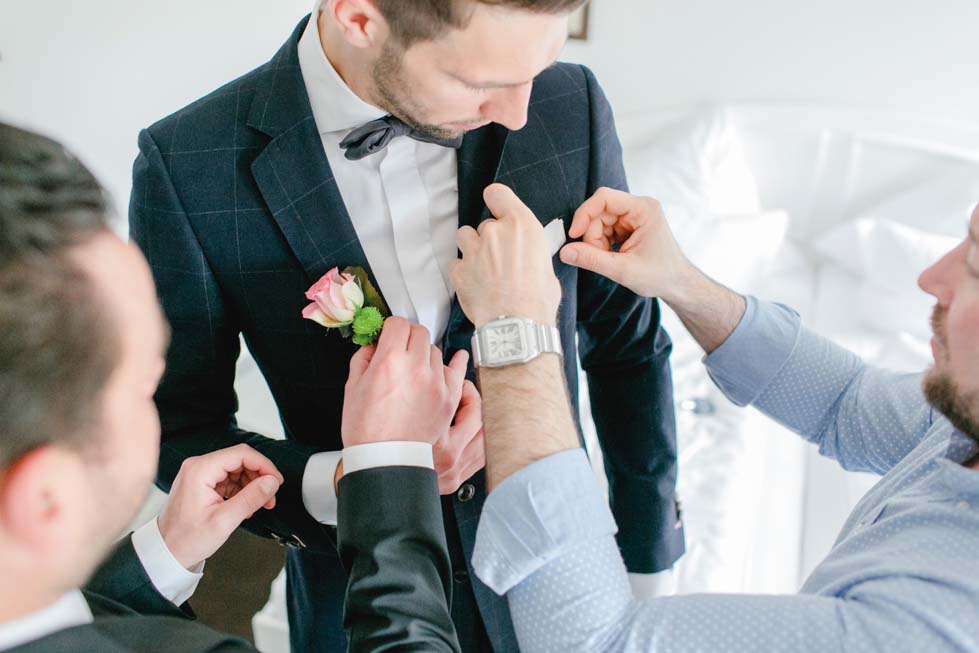 Ebenso wie die Braut könnt ihr mit eurem Trauzeugen, euren Eltern oder den Groomsmen auf die Suche nach eurem Hochzeitsanzug gehen. Auch die Braut darf mit, sofern ihr kein Geheimnis um Outfit machen möchtet und euch erst beim First Look fertig gestylt sehen wollt.