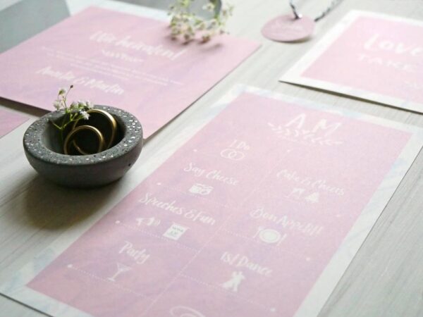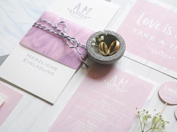 Ob Save-the-Date- und Einladungskarten, ein individuell entworfendes Hochzeitsmonogramm, Tischpläne, Gästebücher, Ringkissen oder Dankeskarten – hier wird jedes Element kreativ und mit viel Gespür für eure Wünsche umgesetzt.