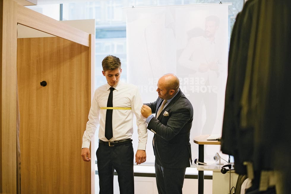 Auch passende Accessoires, Westen und Maßhemden für Trauzeugen oder Väter können vor Ort abgestimmt werden – alles fügt sich stimmig zusammen.