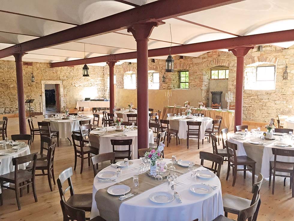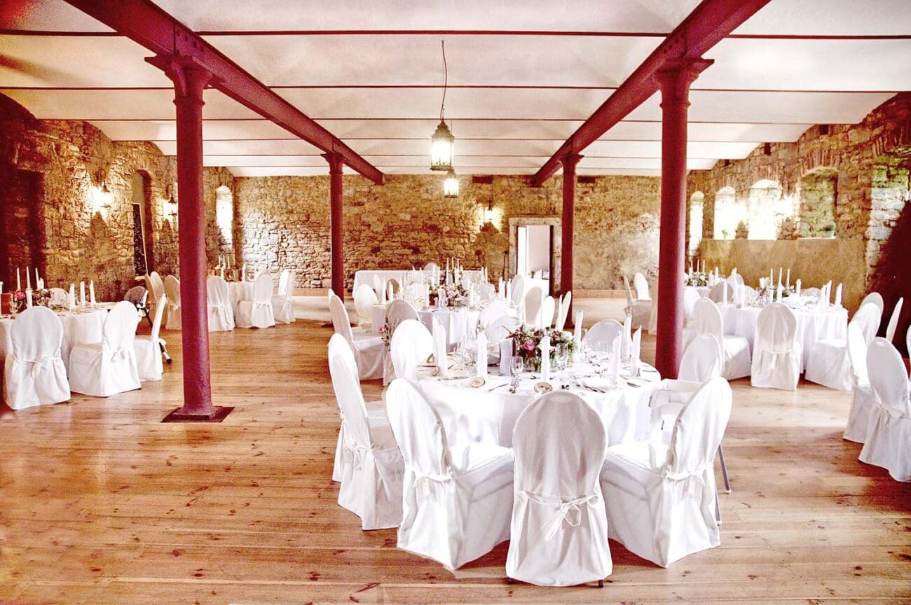 Es erwartet euch der wunderbare Schlosshof – geprägt vom unvergleichlichen Ambiente des traumhaft liebenswerten Wasserschlosses–, der idyllische Schlossgarten für Trauung, Empfang, Kaffee sowie Aktivitäten am Nachmittag und am Abend die prachtvolle Rote Stallung mit Bruchsteinwänden und Holzboden, wo ihr ungestört bis in die Nacht feiern könnt.