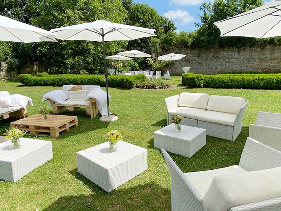 Im Schlossgarten reden und lachen Gäste, spielen Kinder – die beste Basis für eure traumhaft schöne und unbeschwerte Feier bis in die späten Abendstunden.