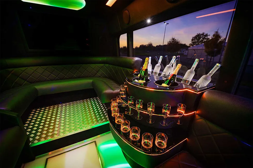 - Ausstattung, die sofort Stimmung macht: LED-Elemente/Discoboden (je nach Bus), starke Soundanlage, Barbereich/Kühlschränke, Screens – beim größeren Bus sogar Karaoke und Dolby Surround