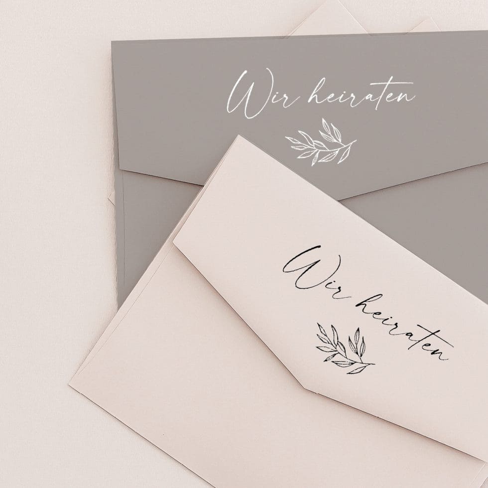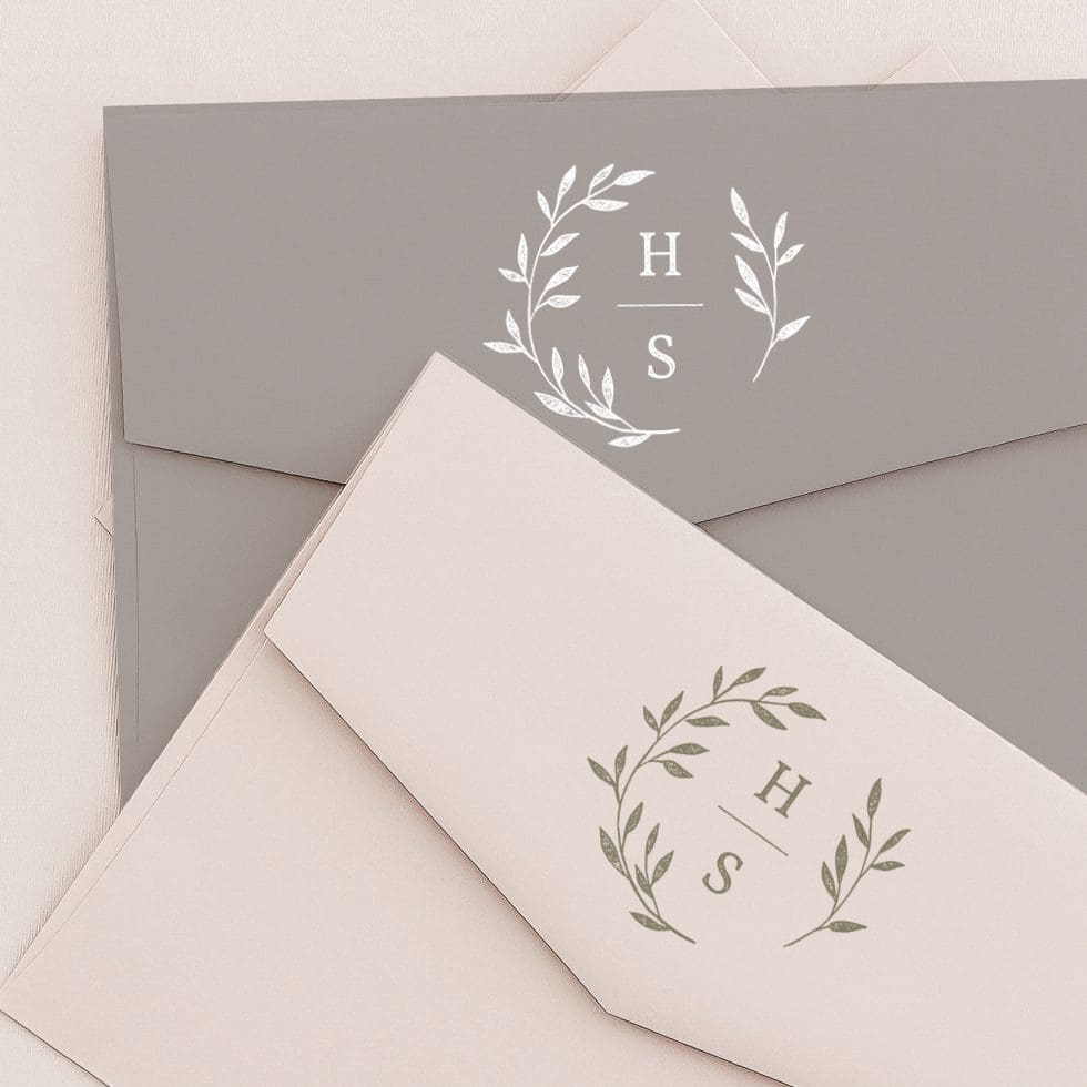 Eine weitere Möglichkeit ist, den Briefumschlag mit eurem Hochzeitslogo hübsch zu gestalten. Ihr könnt es direkt auf das Kuvert oder zuerst auf einen Aufkleber stempeln, der dann als Briefsiegel dient.