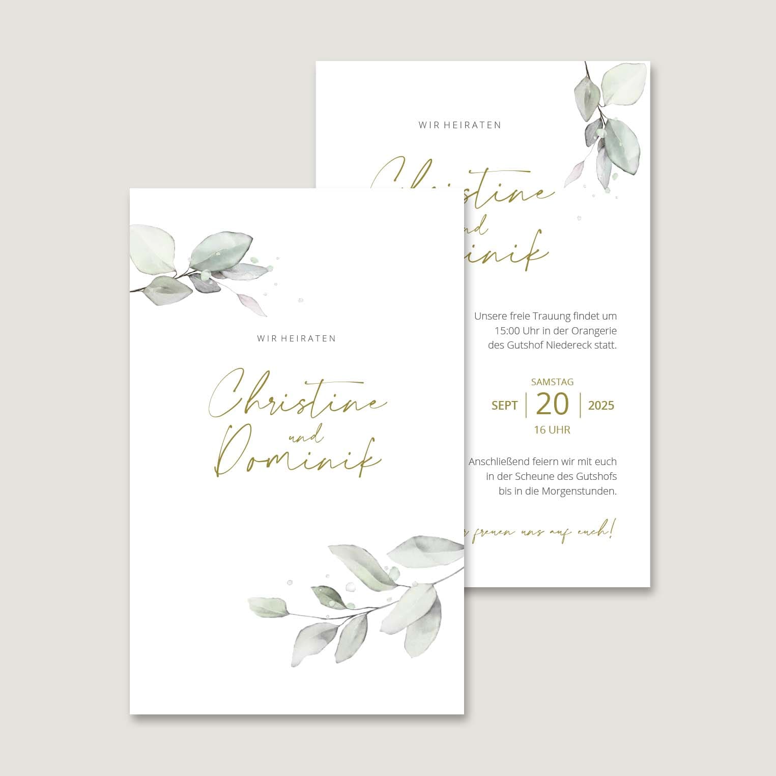 Hochzeitseinladungen im Greenery Style mit Eukalyptus oder Olivenzweigen ist für alle Hochzeitsstile absolut angesagt. Kein Wunder, denn das silbrige Salbeigrün ist auch bei der Gestaltung der Hochzeitsdeko und aller Accessoires einfach traumhaft stimmungsvoll.