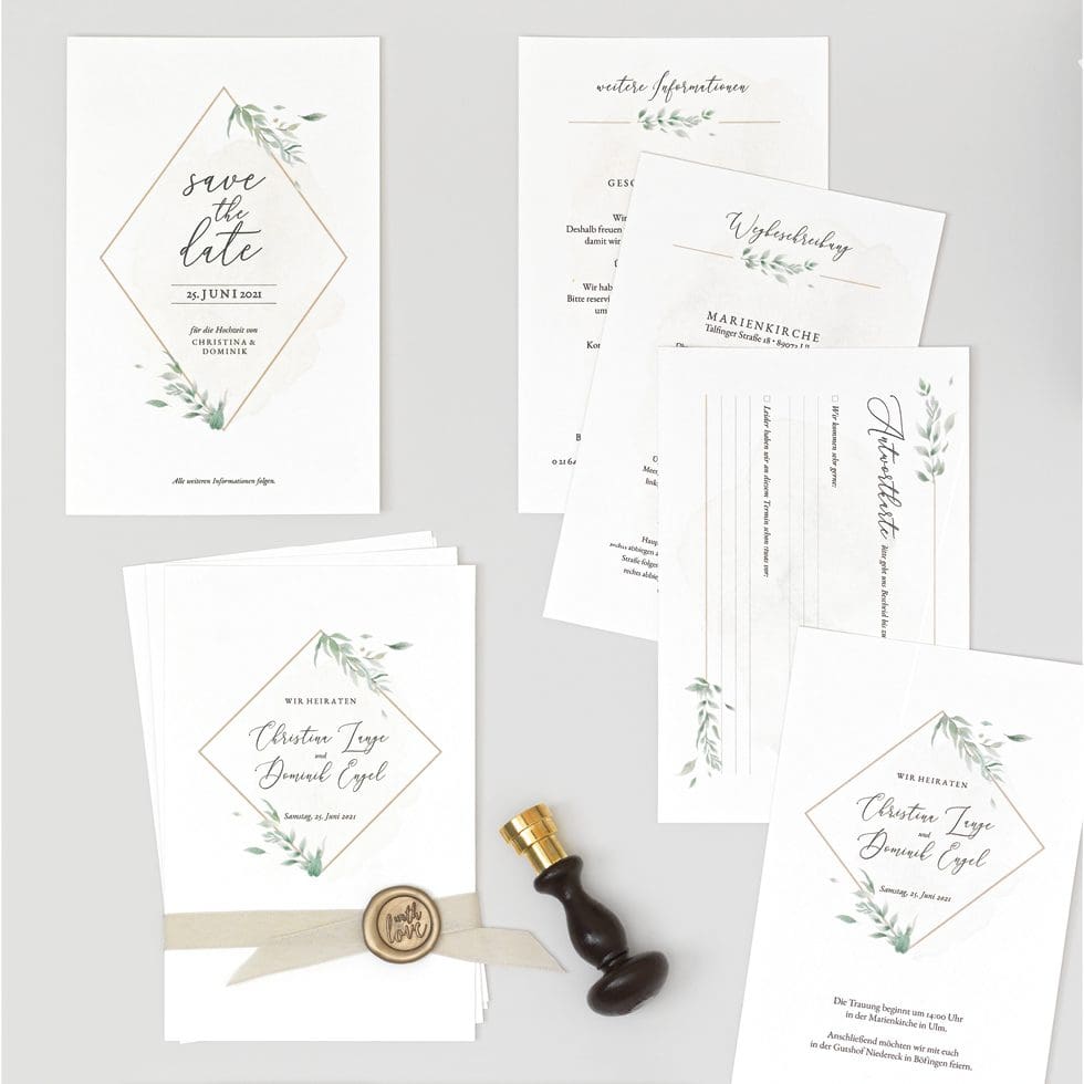 Es gibt unzählige Papeterie-Anbieter, in denen ihr eure Karten selbst online gestalten könnt. Tipp: Besonders einfach ist dies, wenn ihr den vorgeschlagenen Text verwendet und nur die Namen, Daten und Orte verändert.