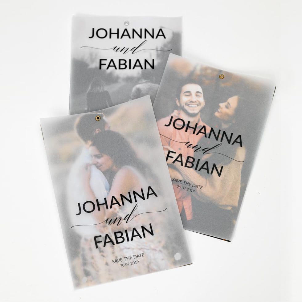 Besonders beliebt sind Overlays. Das ist in der Regel in Schwarz bedrucktes Transparentpapier mit euren Namen, einem Hochzeitsspruch oder dem Einladungstext.