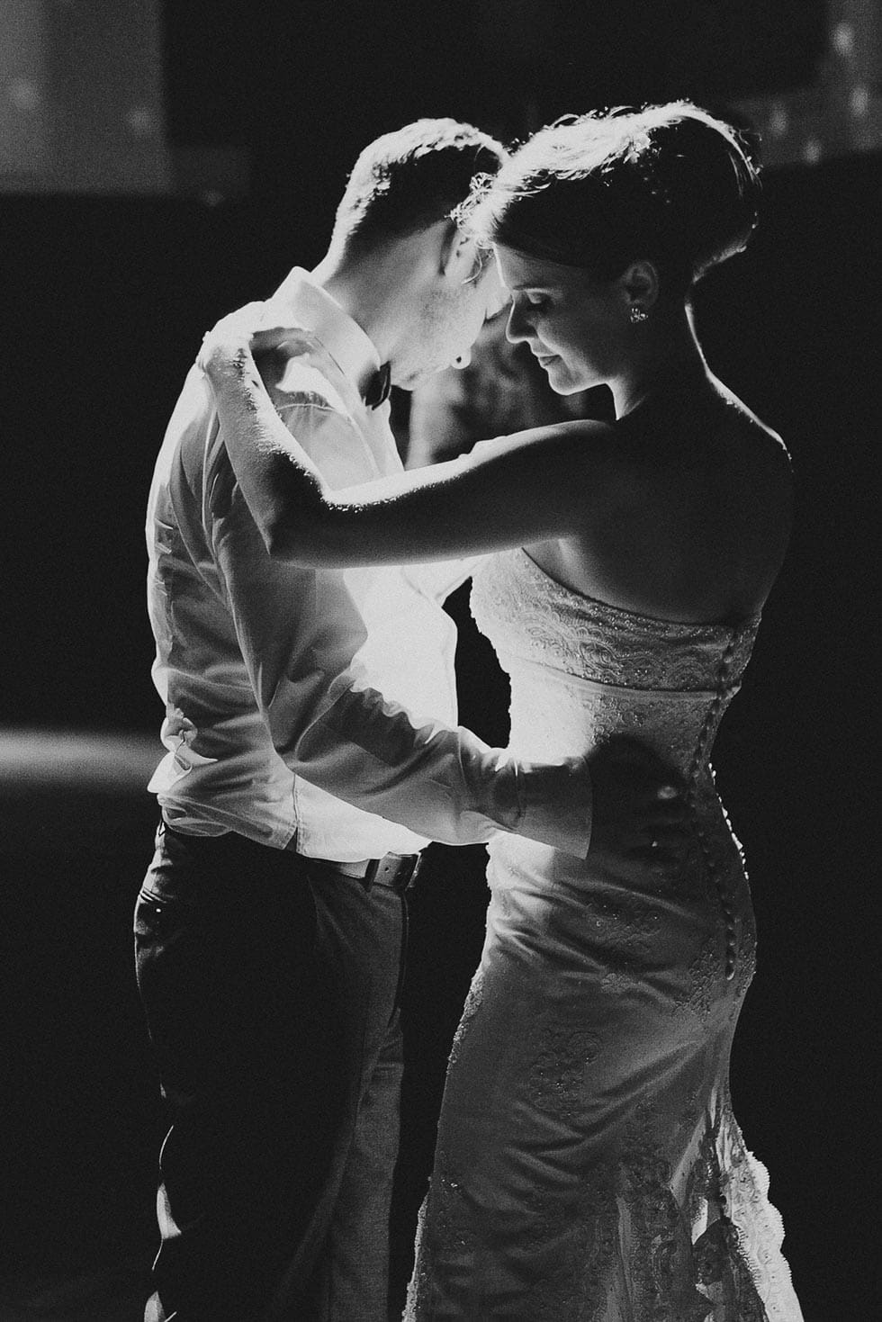 Große Kunst: Ein scharfes Bild in wenig beleuchteter Atmosphäre vom Eröffnungstanz – perfekt mit Fokus auf das Paar ausgeleuchtet.