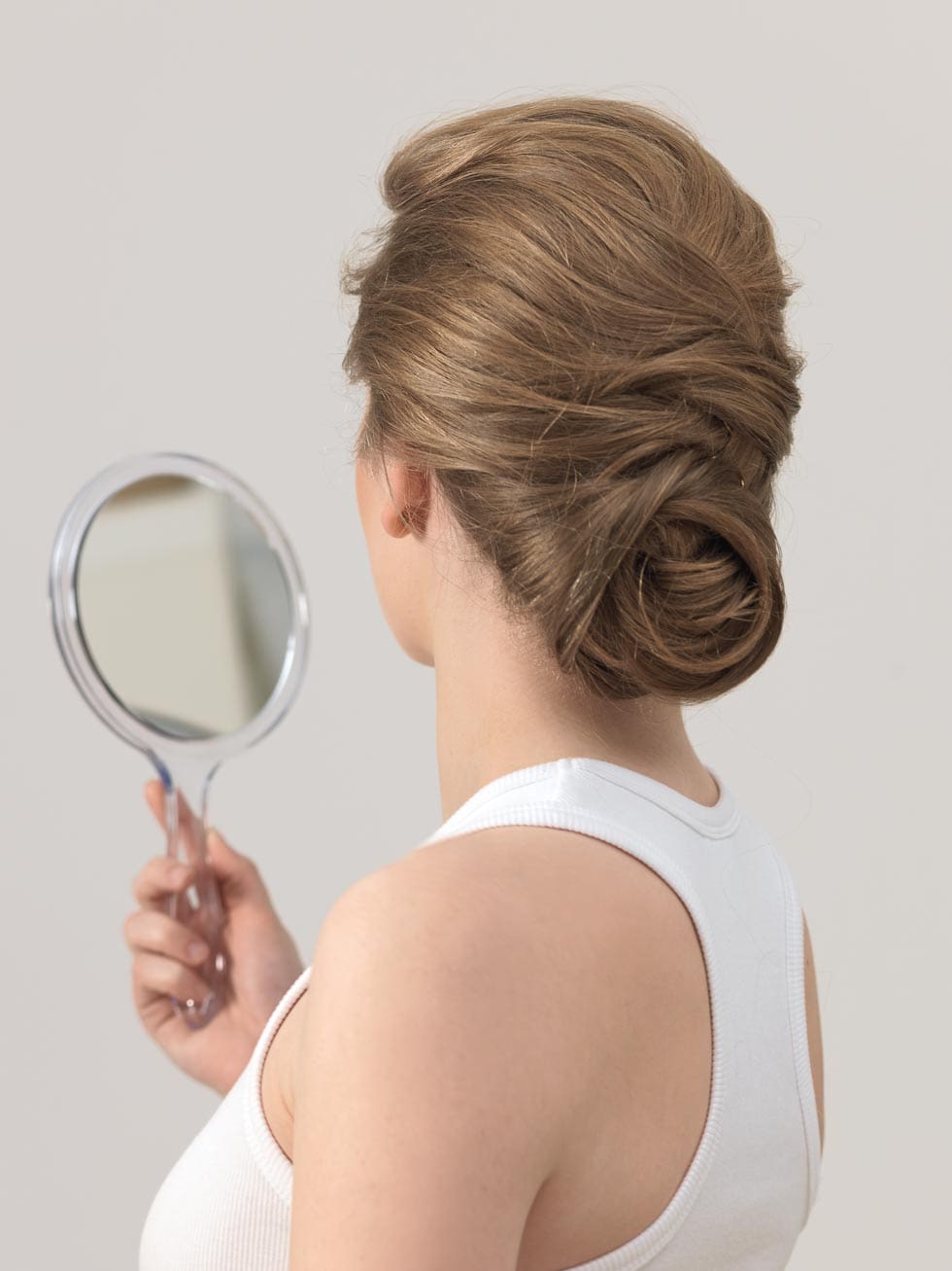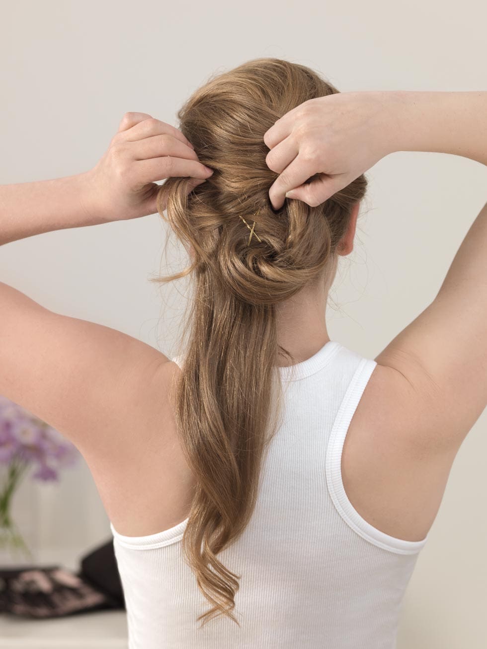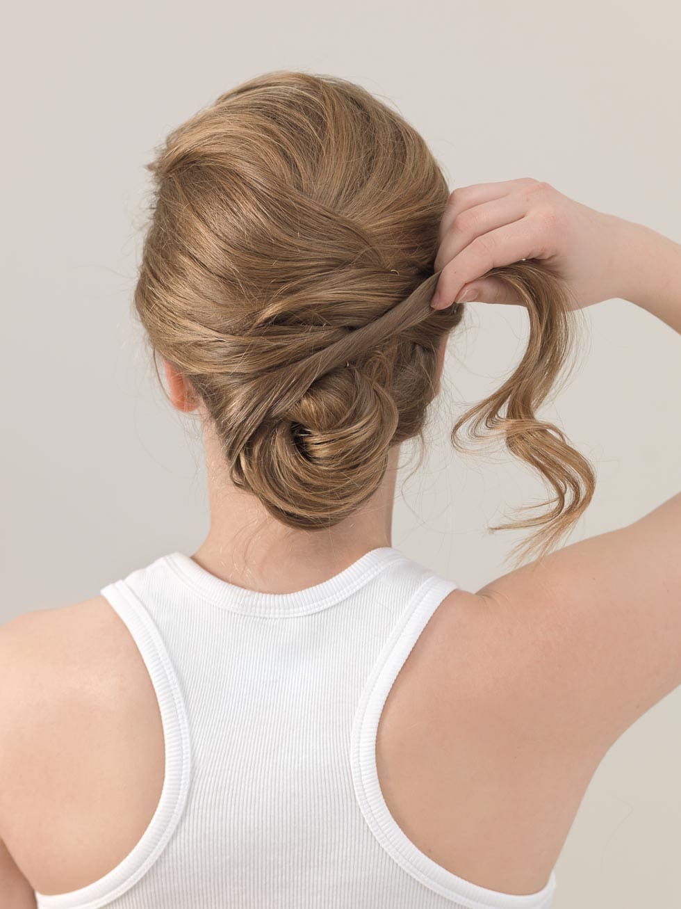 Habt ihr ein Haarkissen verwendet, legt ihr einzelne Strähnen wie in 4 beschrieben über den Dutt, verdeckt auf diese Weise und steckt die Strähnen unterhalb des Haarkissens fest.