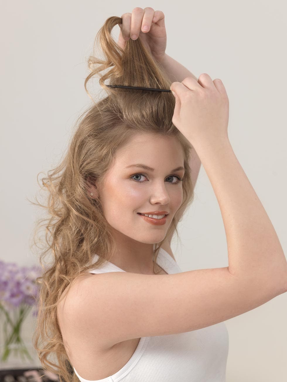 Damit die Hochzeitsfrisur nicht zu streng wirkt, wird jetzt der Oberkopf toupiert, um mehr Volumen zu erhalten.