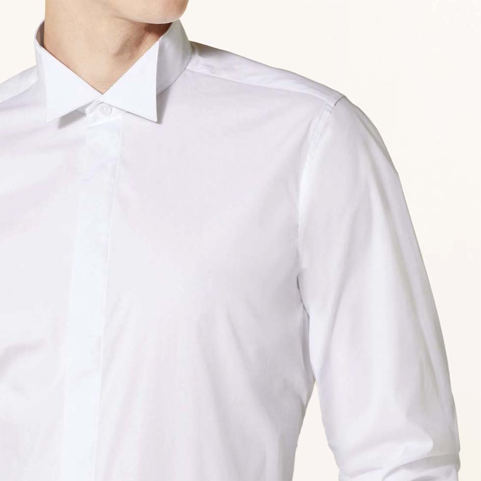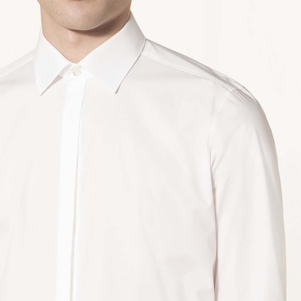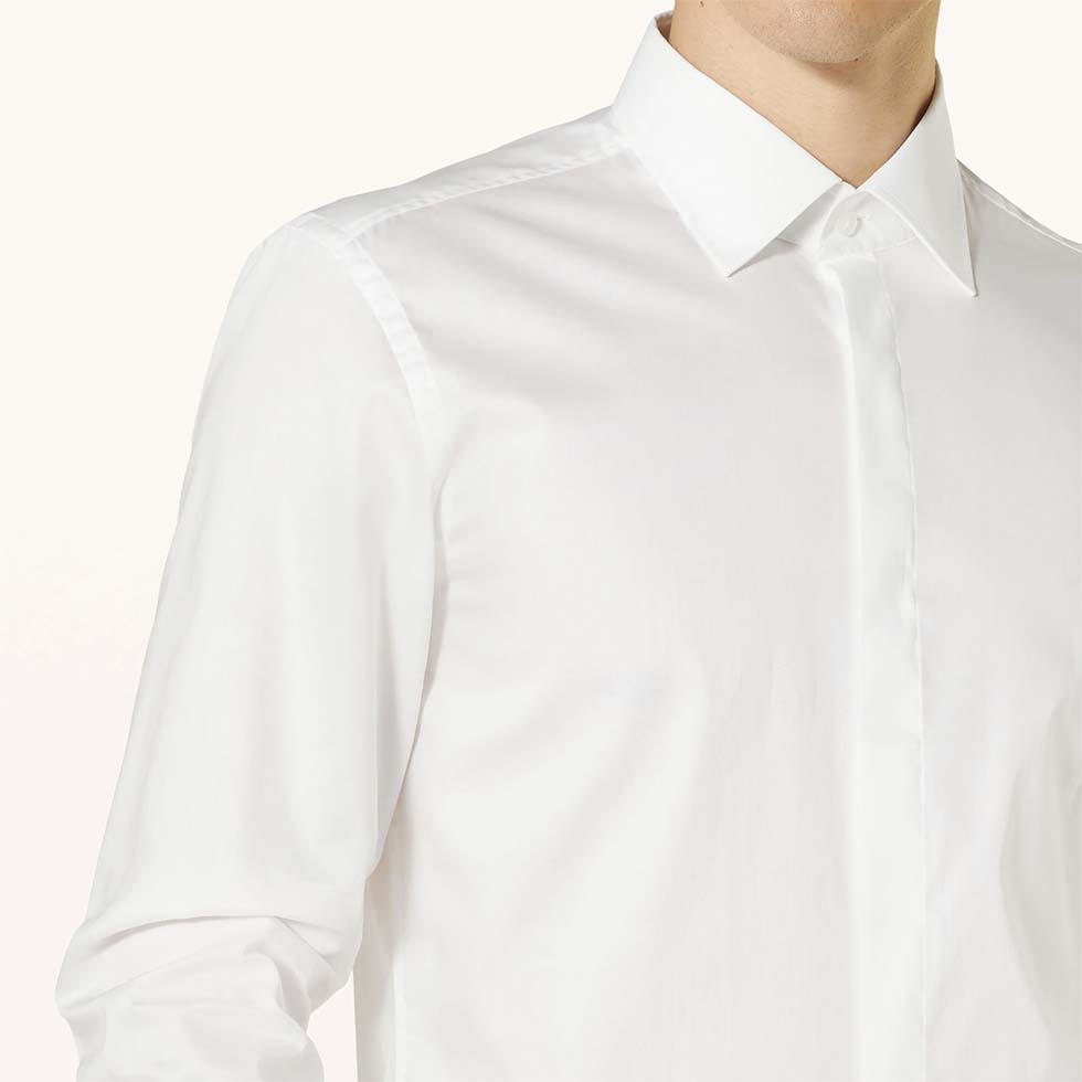 Hochzeitshemden – vor allem in Kombination zu eleganten Anzügen – haben immer eine verdeckte Knopfleiste.