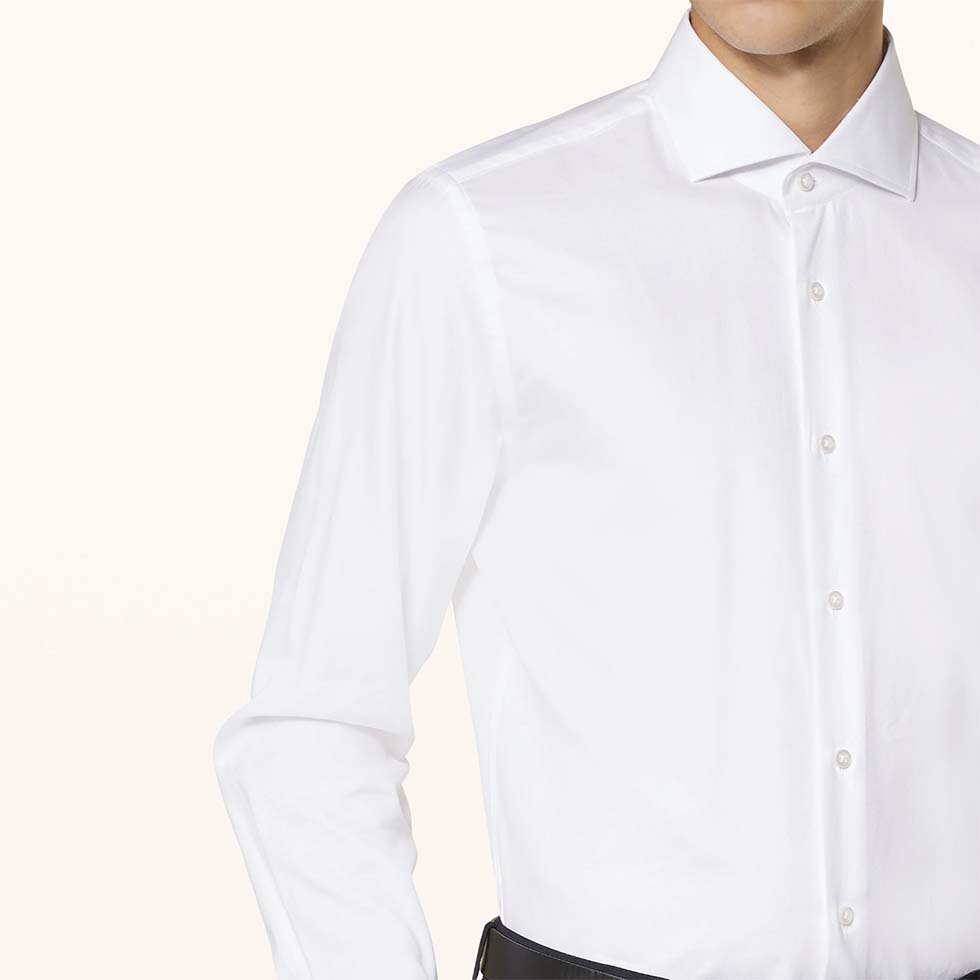 - Stehkragenhemd: ein elegantes Smokinghemd mit kurzen Kragenecken – perfekt für die Ergänzung einer Fliege geschnitten