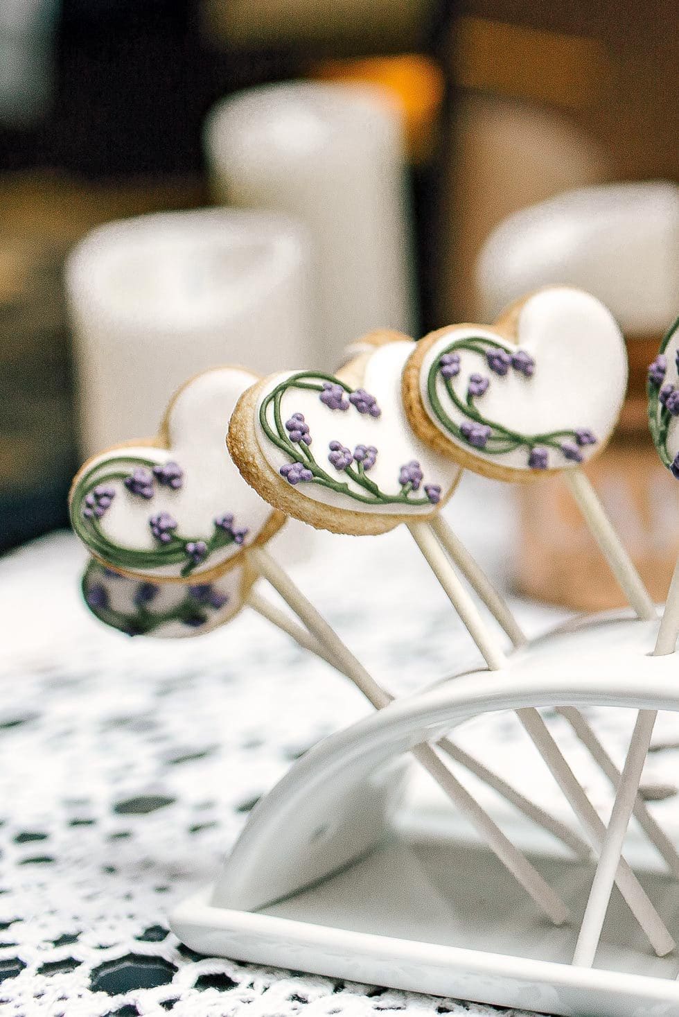 Auf diese Weise sind auch die Hochzeitskekse unten als Lollies dekoriert worden. Vor dem Backen müsst ihr dafür lediglich einen Lollistiel* in die Kekse drücken.