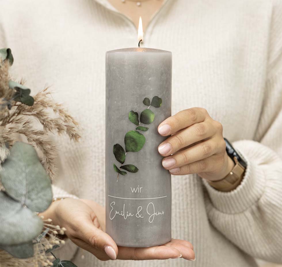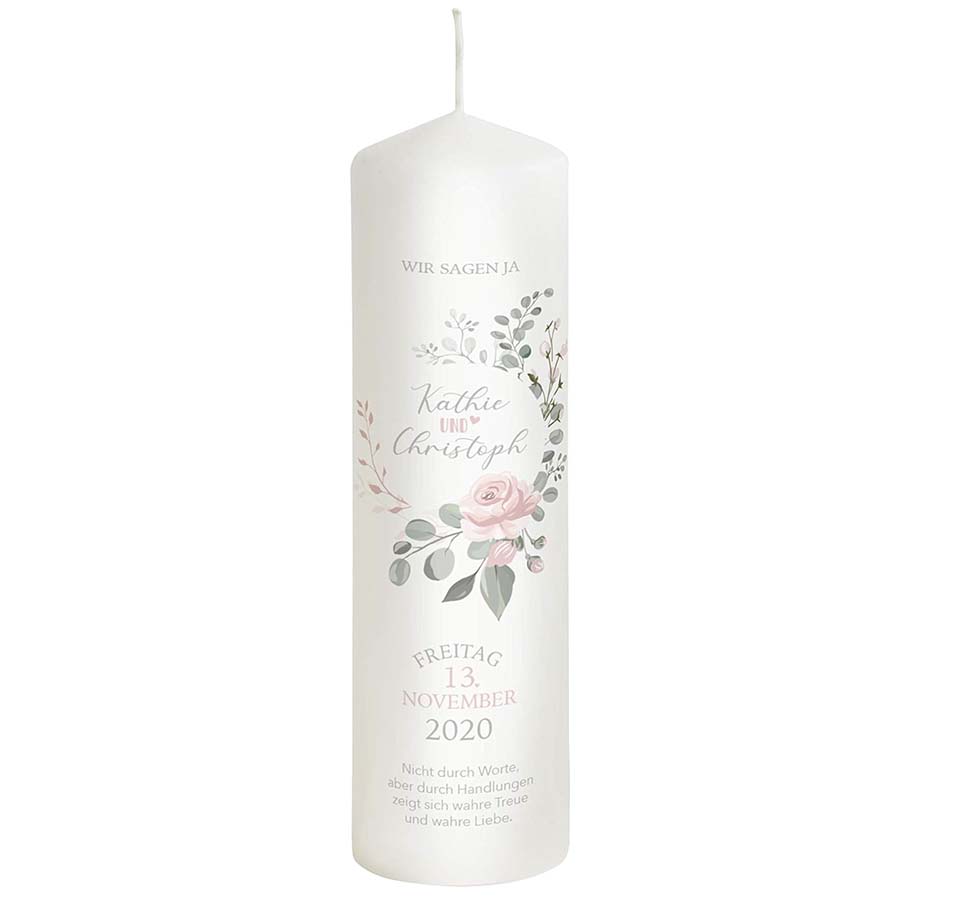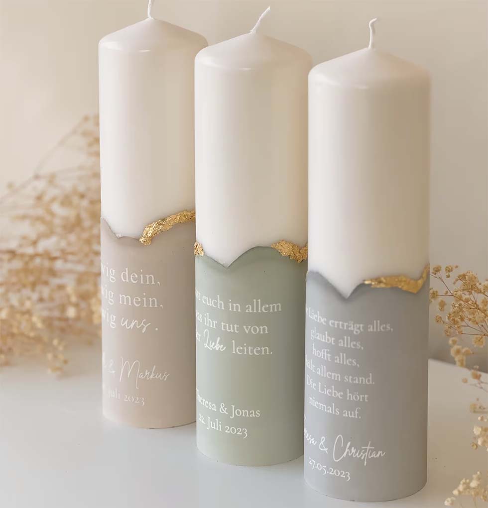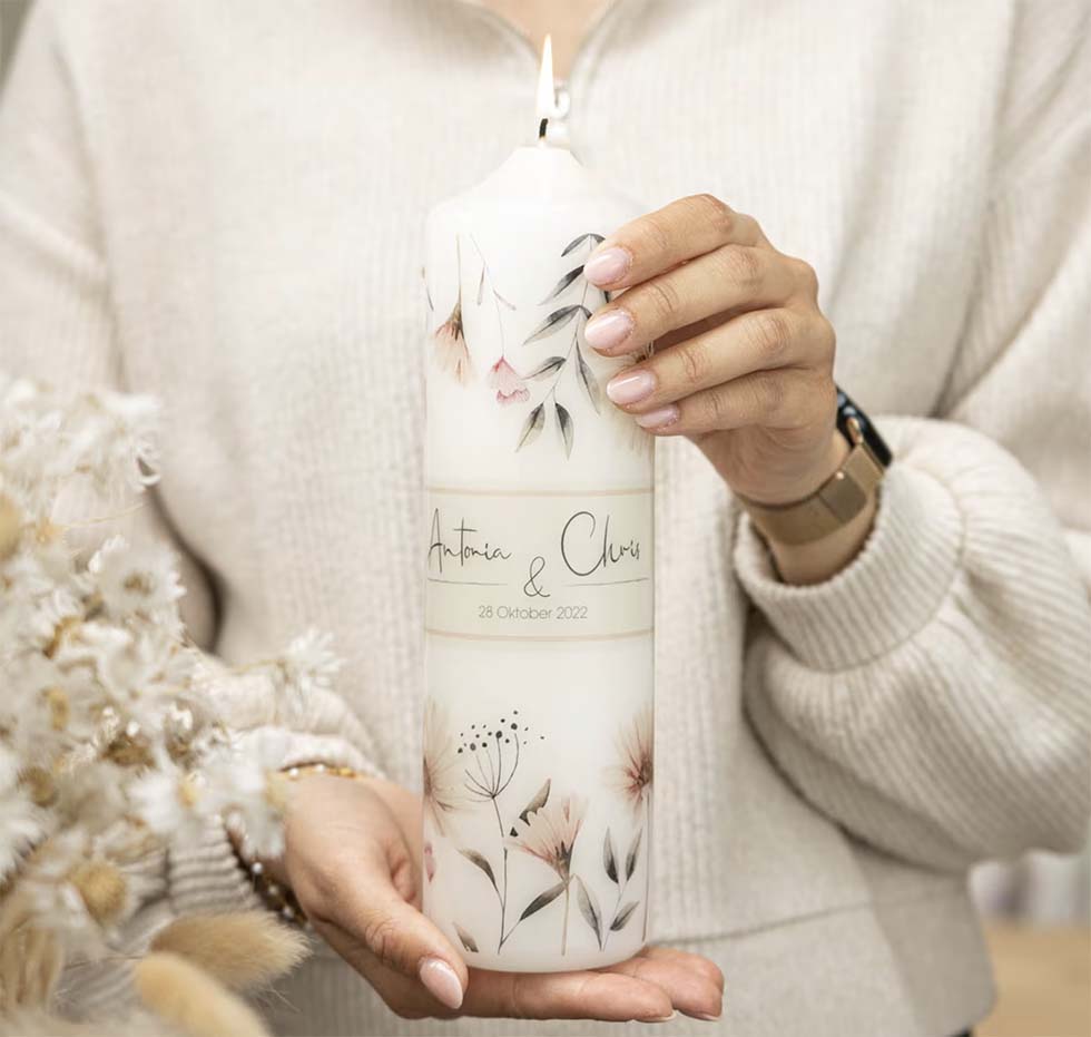 Besonders persönlich wird sie zusätzlich, wenn ihr euren Trauspruch oder euer Eheversprechen aufdrucken lasst. Denn die Aufgabe der Traukerze ist ja auch, euch auch in schlechten Zeiten an die besondere Verbundenheit zu erinnern, die ihr bei eurer Trauung gespürt habt.