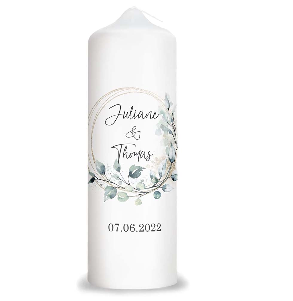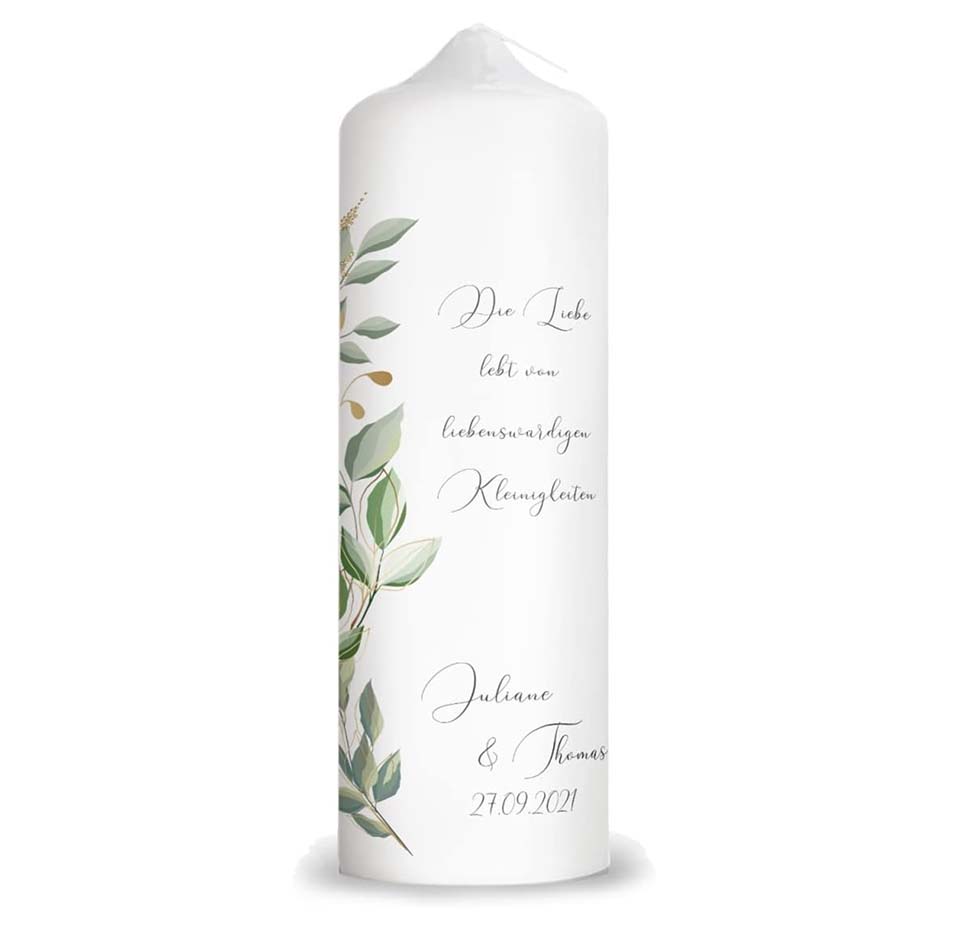 Das Eukalyptus-Design dieser Brautkerze ist auf wundervolle Weise mit Trauspruch, Datum und den Namen des Brautpaars gestaltet.