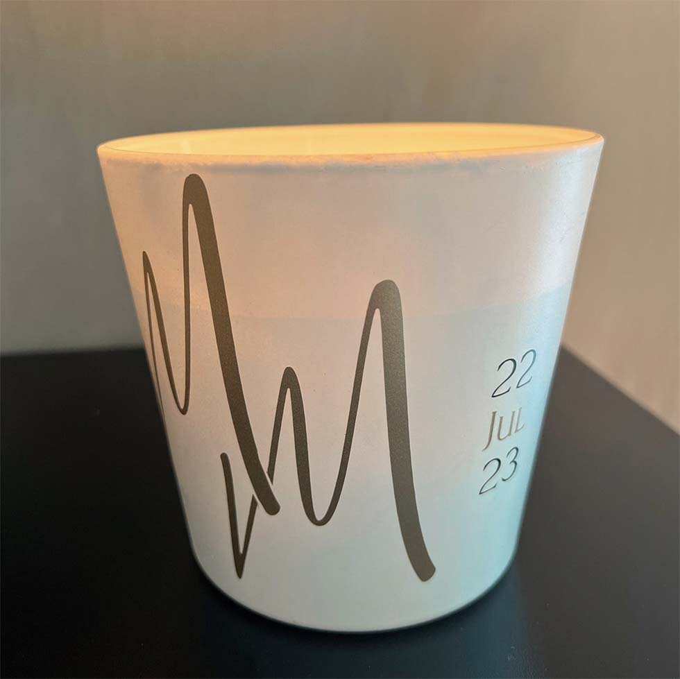 Statt der eigentlichen Kerze könnt ihr auch ein Windlicht zum Beispiel mit geplotteten Schriftzügen oder Logos gestalten. Der Vorteil: Die Kerze könnt ihr immer wieder austauschen und euer Licht bleibt wunderschön erhalten.