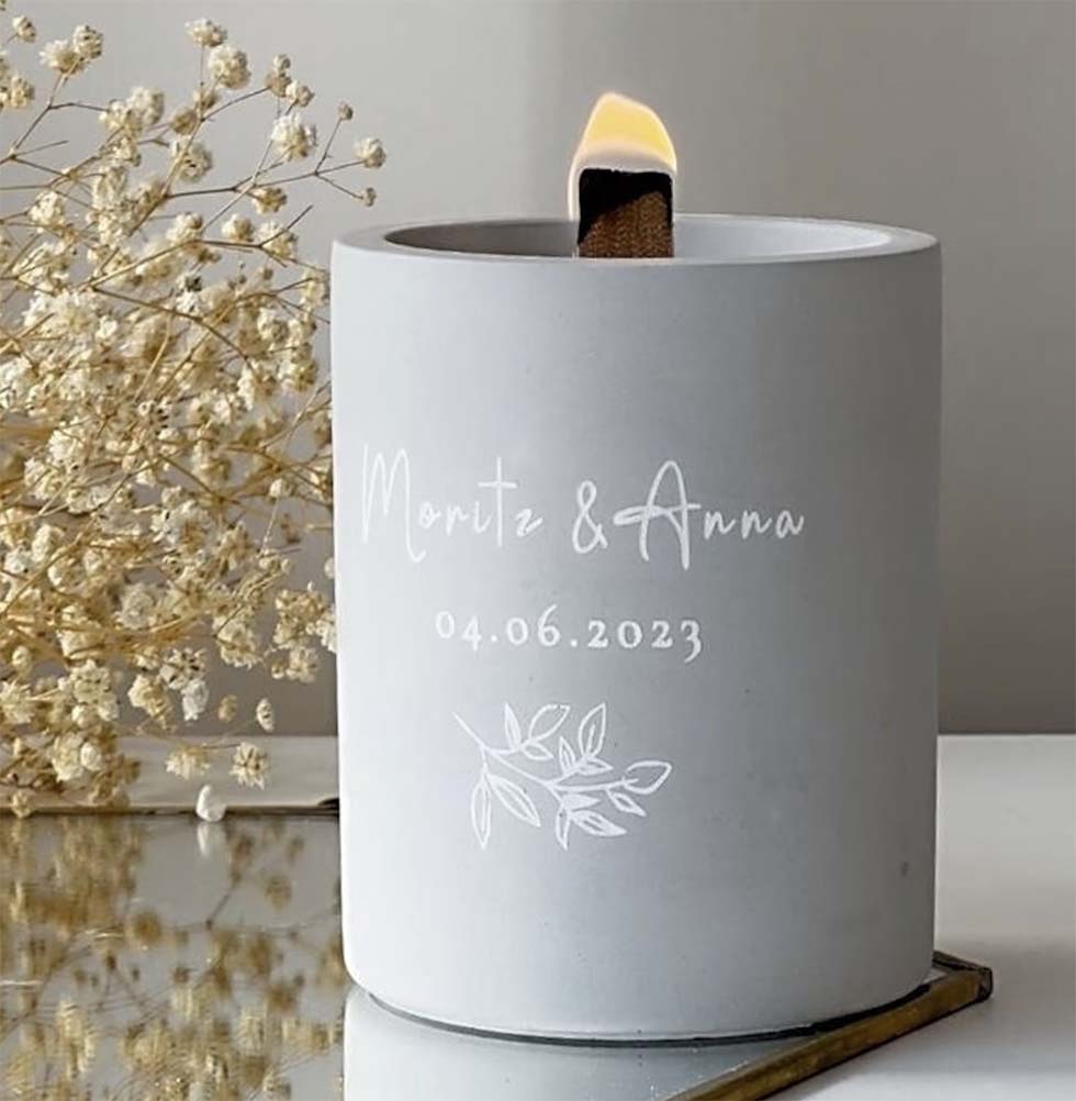 Ergänzt dieser nachfüllbaren Trauzkerze eine persönliche Aufschrift und lasst sie mit einem Blätterkranz individuell nach euren Wünschen gestalten.
