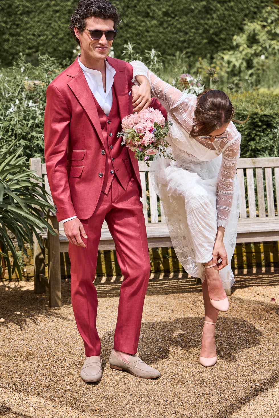 Denn zu einem legeren Hochzeitsanzug passen klassische Hochzeitsschuhe ebenso wie coole Sneakers oder auch Slipper – je nach gewünschtem Coolness-Grad.