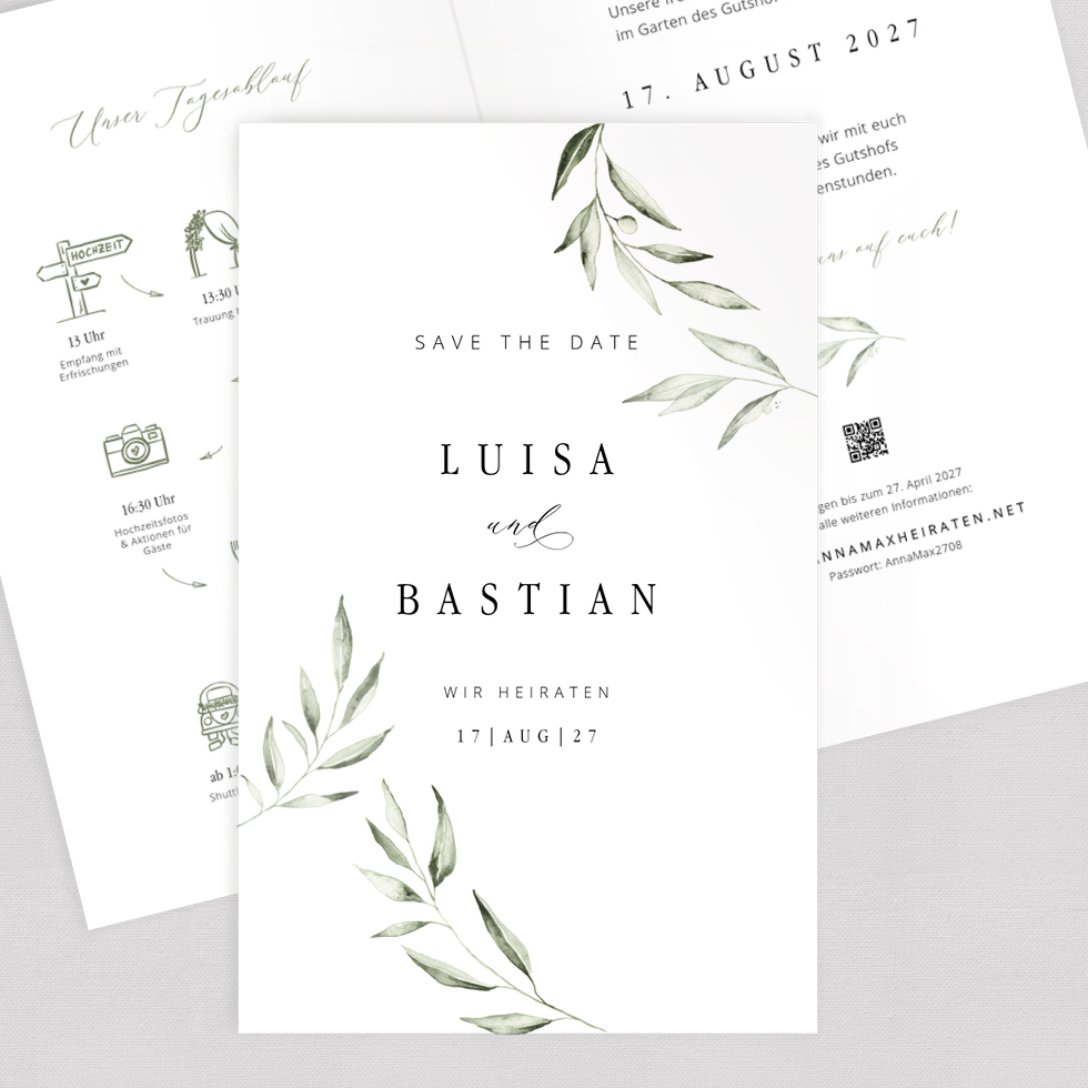 →Hier könnt ihr diese und weitere Hochzeitseinladungen im Greenery Look ansehen
