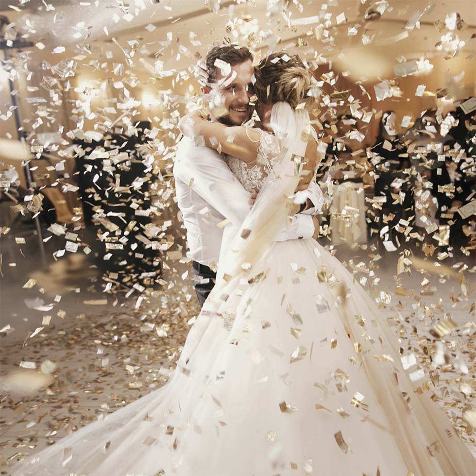 Jedes Finale wird mit Konfetti gekrönt – so auch der Hochzeitstanz. Ob Blüten-Konfetti oder laut knallende Konfetti-Kanonen – damit ergänzt ihr immer ein besonderes Highlight. Nachhaltig und nicht abfärbend ist weißes Blüten- oder Konfetti für eure Hochzeit.