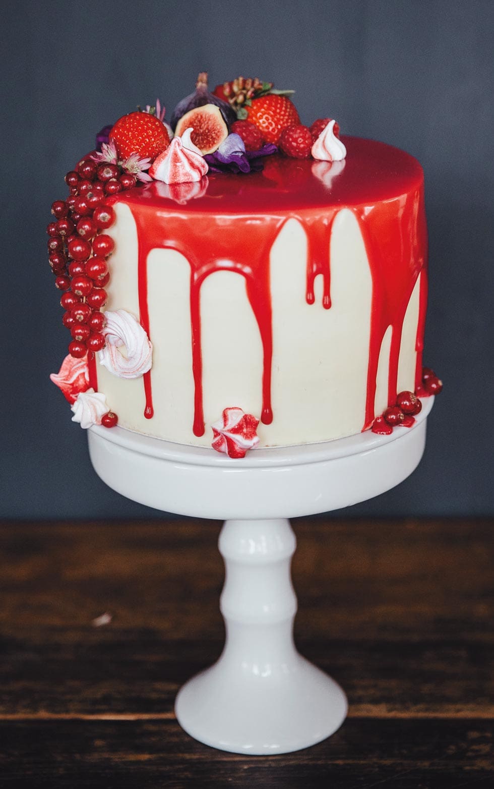 Alternativ gibt es für den Drip auch Zuckerglasuren in allen Farben und sogar goldene oder silberfarbene Zuckerglasuren, die an der Kante heruntertropen.