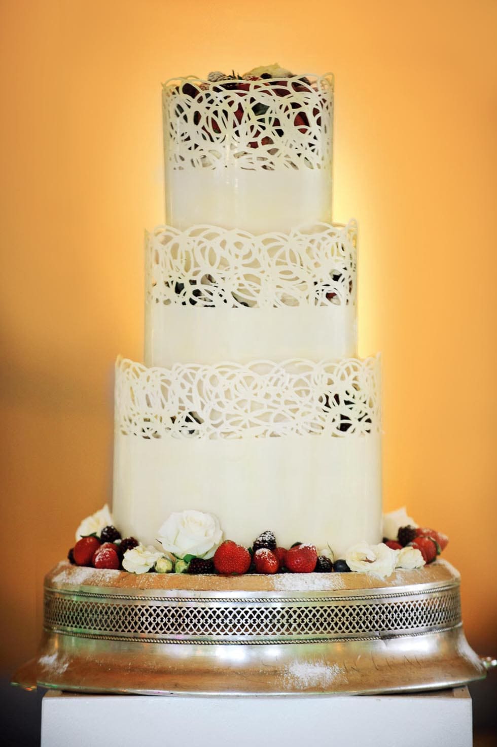 Torten mit filigranem Spritzdekor gehören bei Hochzeiten ebenfalls zu den Upper-Class Designs, denn diese Dekortechnik können nur noch wenige Konditoren.