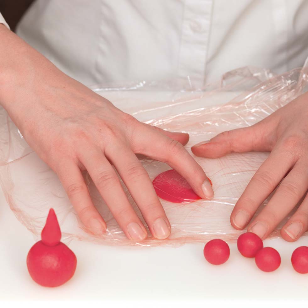 Formt aus dem gefärbten Marzipan unterschiedlich große Kugeln und rollt die Kugeln mit den Handballen zu Tropfen.