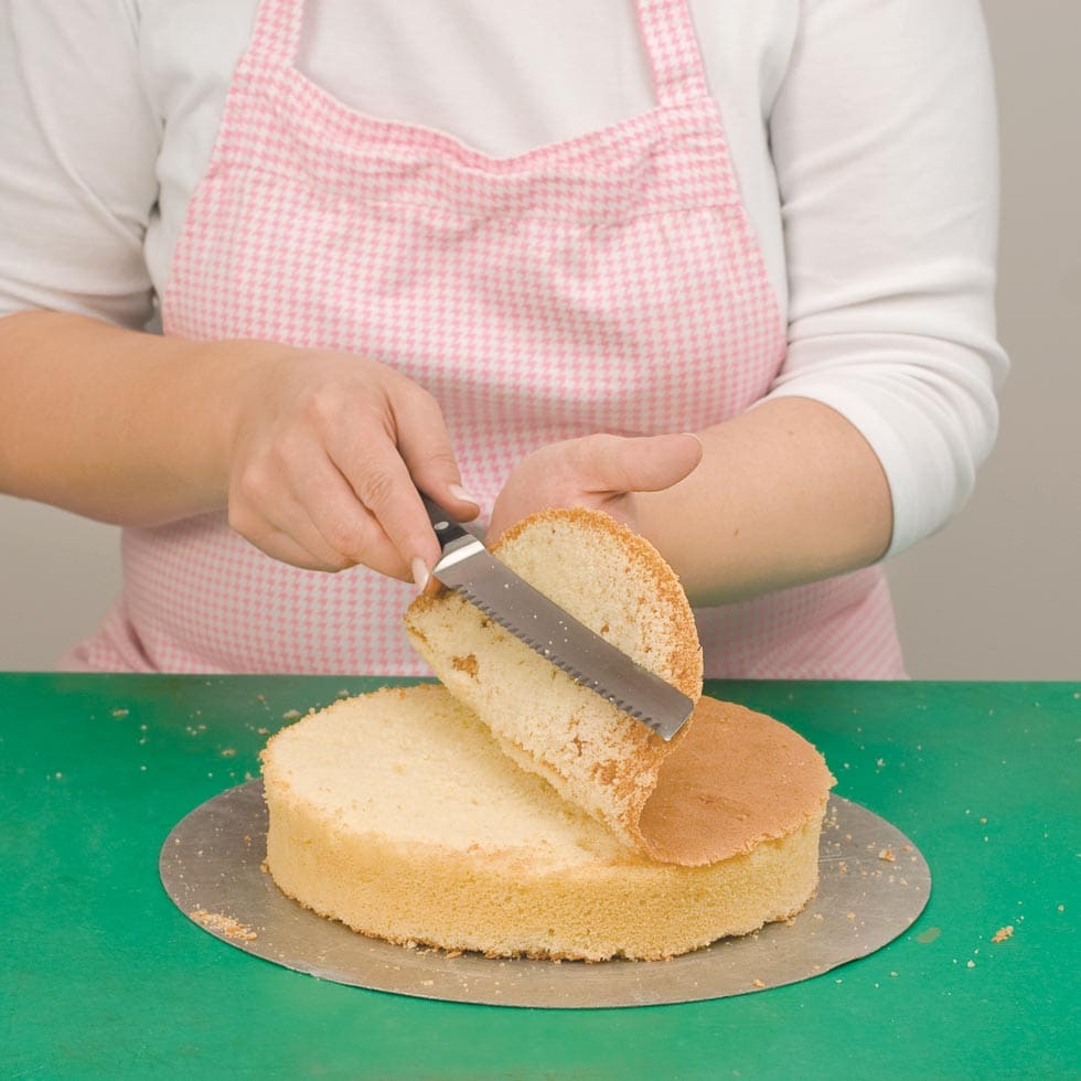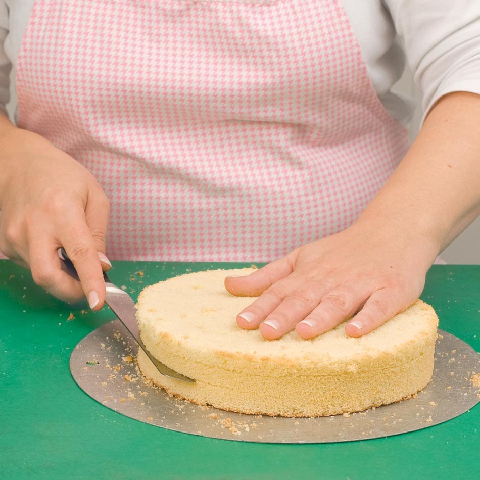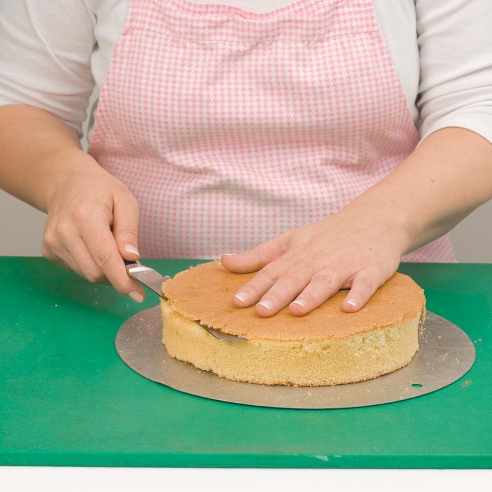Das Messer wird dabei gerade gehalten und nicht von der Stelle bewegt. Die Platte fortwährend drehen, bis der Schnitt komplett durch die Torte geht.