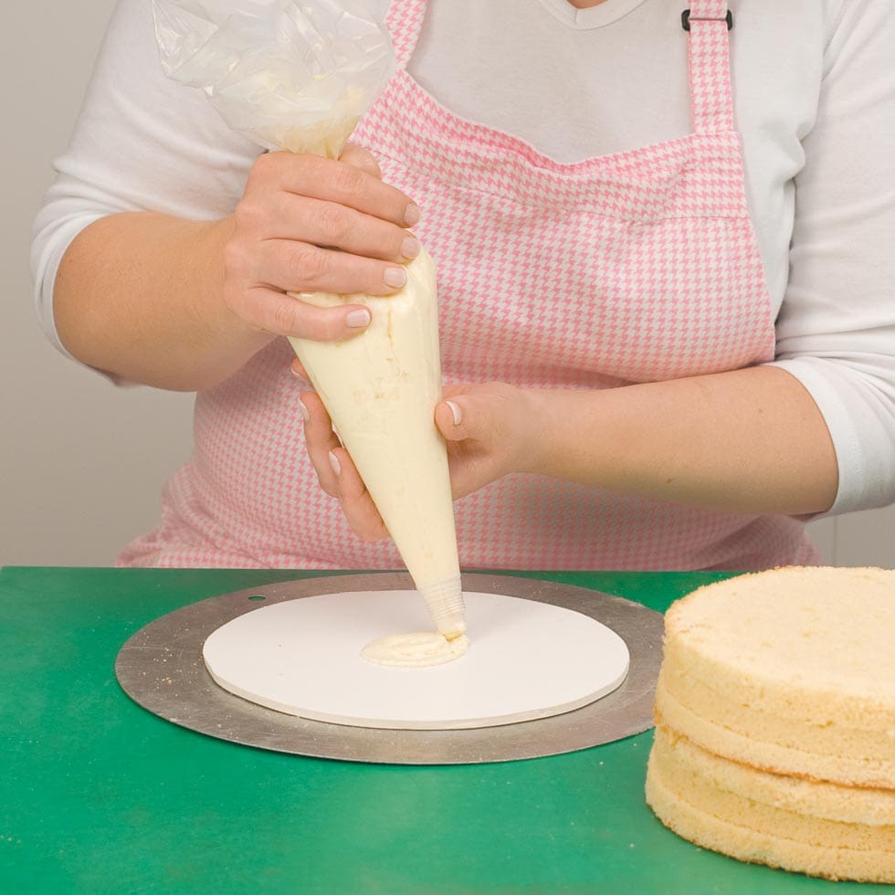 Einen Spritzbeutel mit der Tüllenbefestigung versehen und mit der Creme füllen. Dann einen kleinen Klecks Creme auf die Kappaplatte spritzen. Dieser dient zur Fixierung des untersten Bodens auf der Kappaplatte.