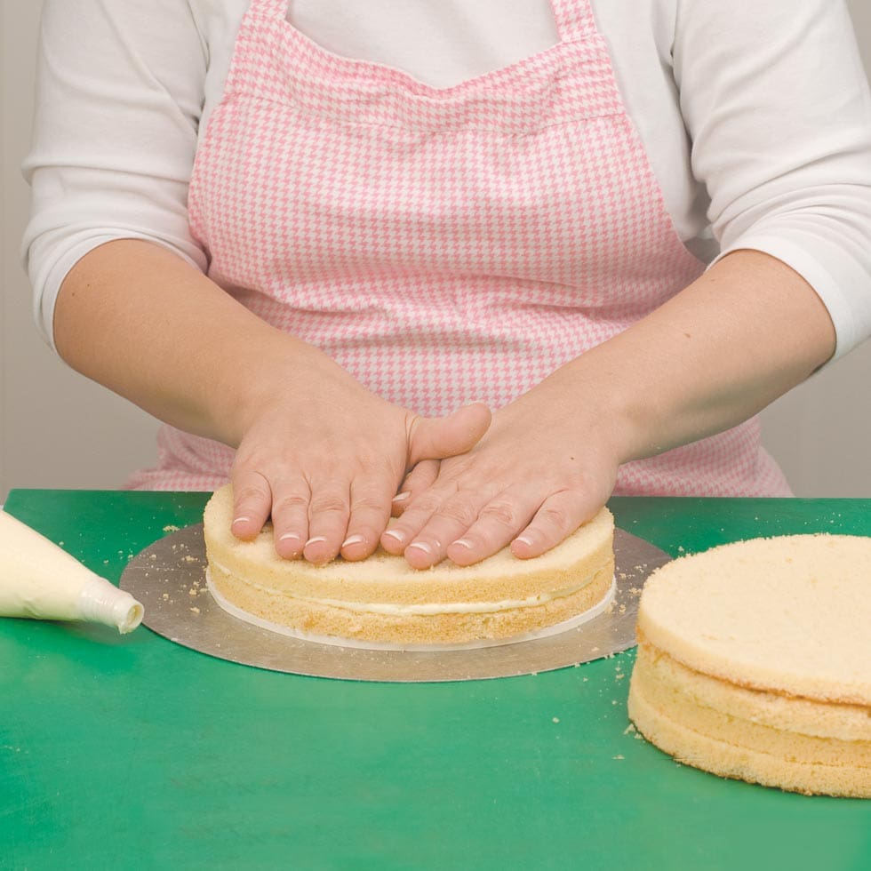 Wir erstellen in unserem Beispiel eine mehrstöckige Hochzeitstorte. Deshalb erhält jede Stufe einen eigenen Tortenboden, um später problemlos übereinander gestapelt zu werden.