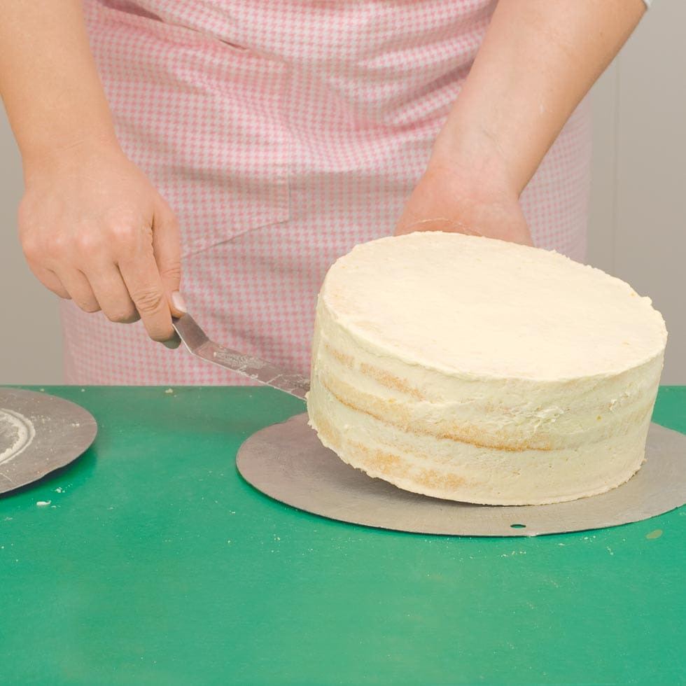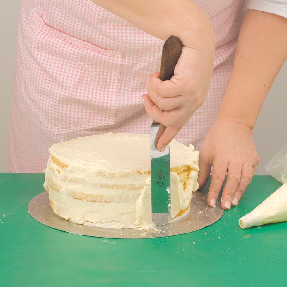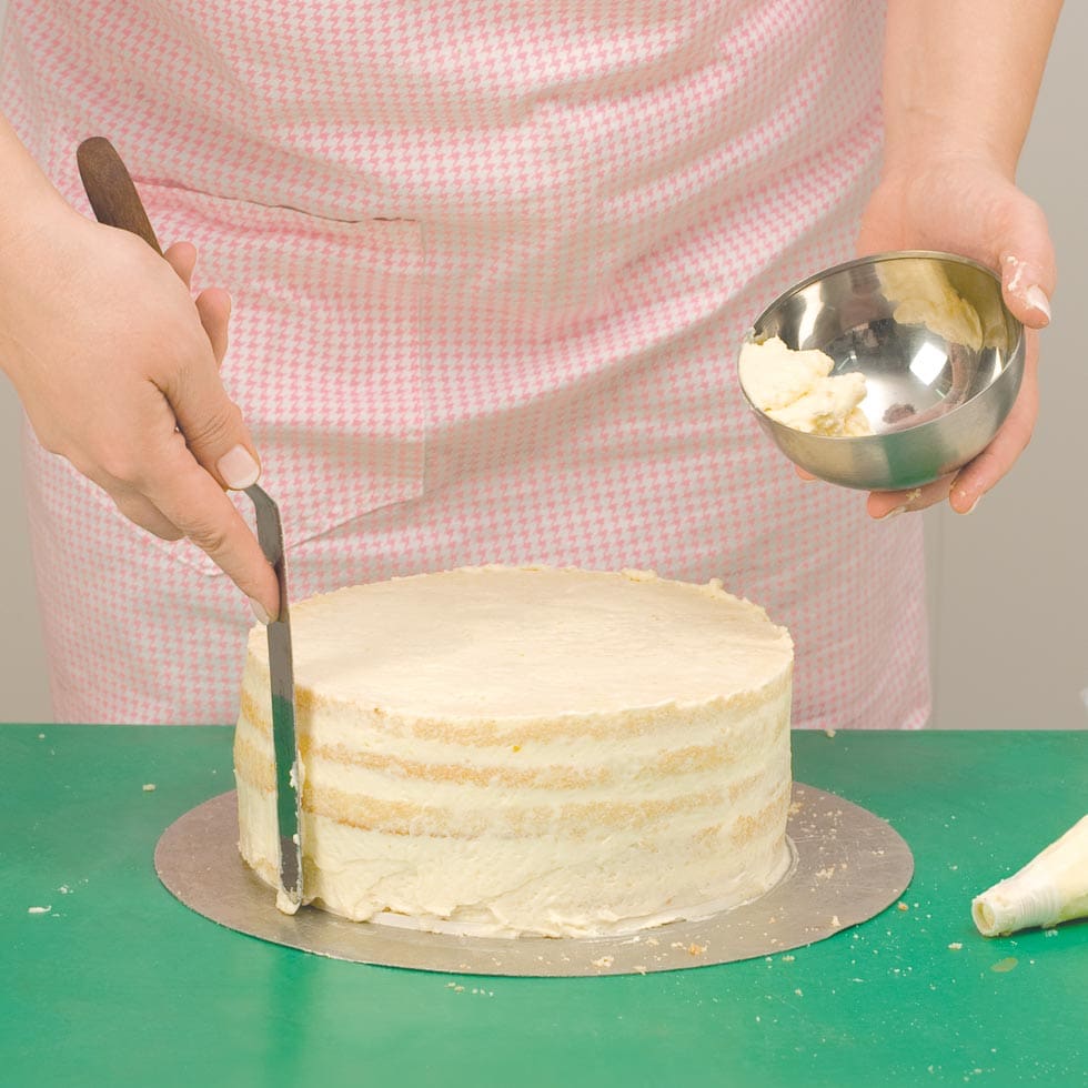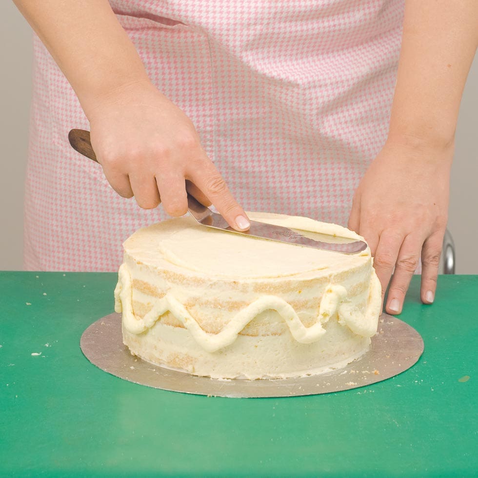 Jetzt überschüssige Creme abnehmen und die Torte dabei immer weiter glatt streichen.