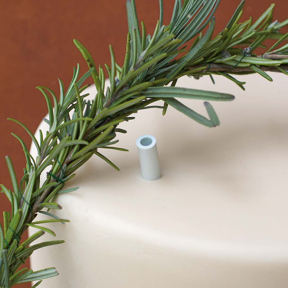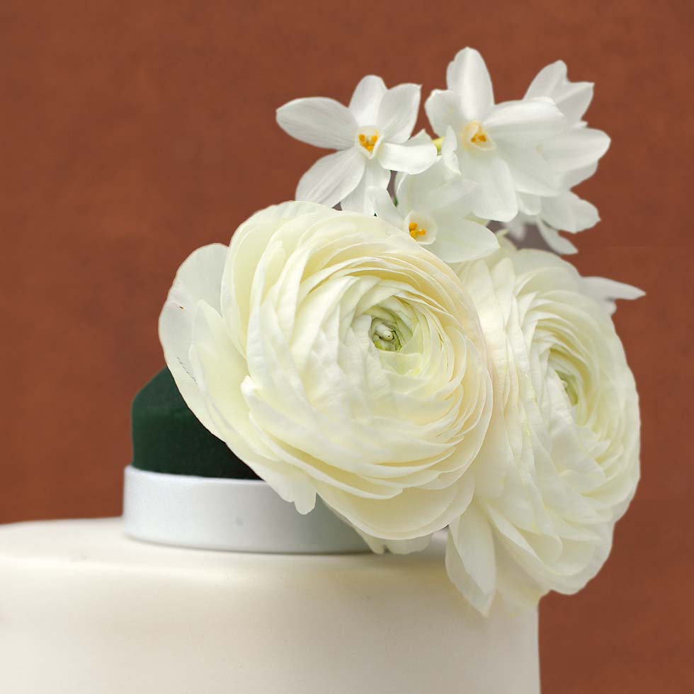 - Blüten mit weichen Stielen am besten zuvor anzudrahten, damit sie so gebogen werden können, dass sie auf keinen Fall die Torte berühren.