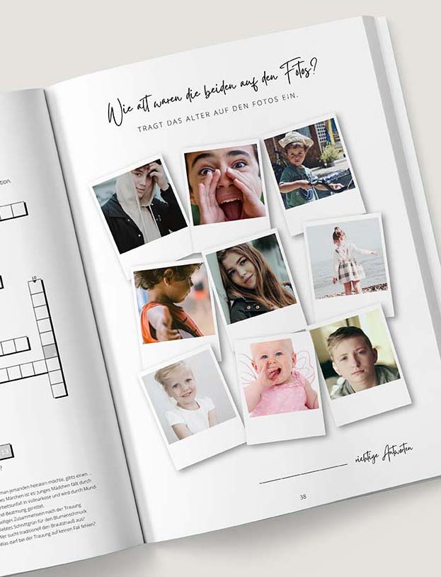 Fotos liebt jeder in der Hochzeitszeitung – warum daraus nicht zusätzlich gleich ein tolles Rätsel machen? Ob Jahreszahlen-Raten oder "Wo wurde das Foto gemacht?" - damit habt ihr zwei beliebte Inhalte in eurer Hochzeitszeitung miteinander kombiniert.